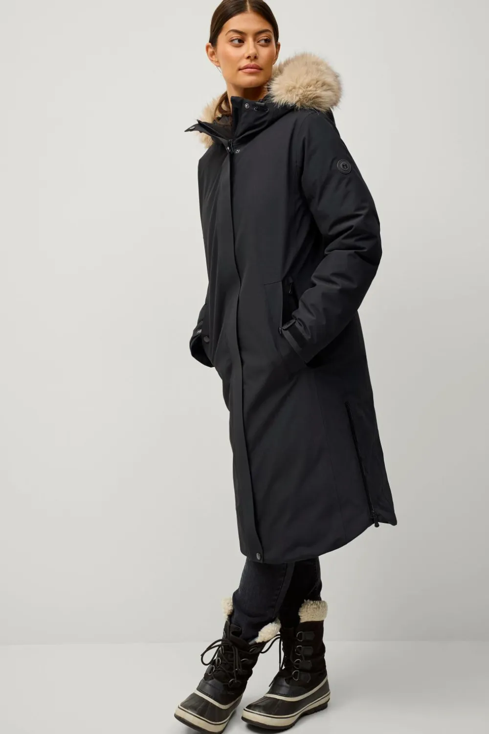 • Fast, justérbar hætte med træksnørre og aftagelig kunstpelskant