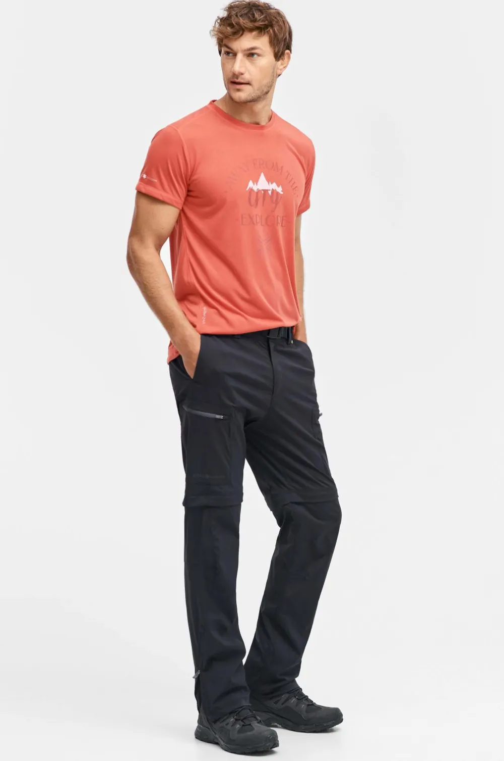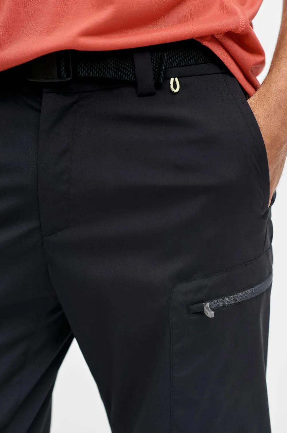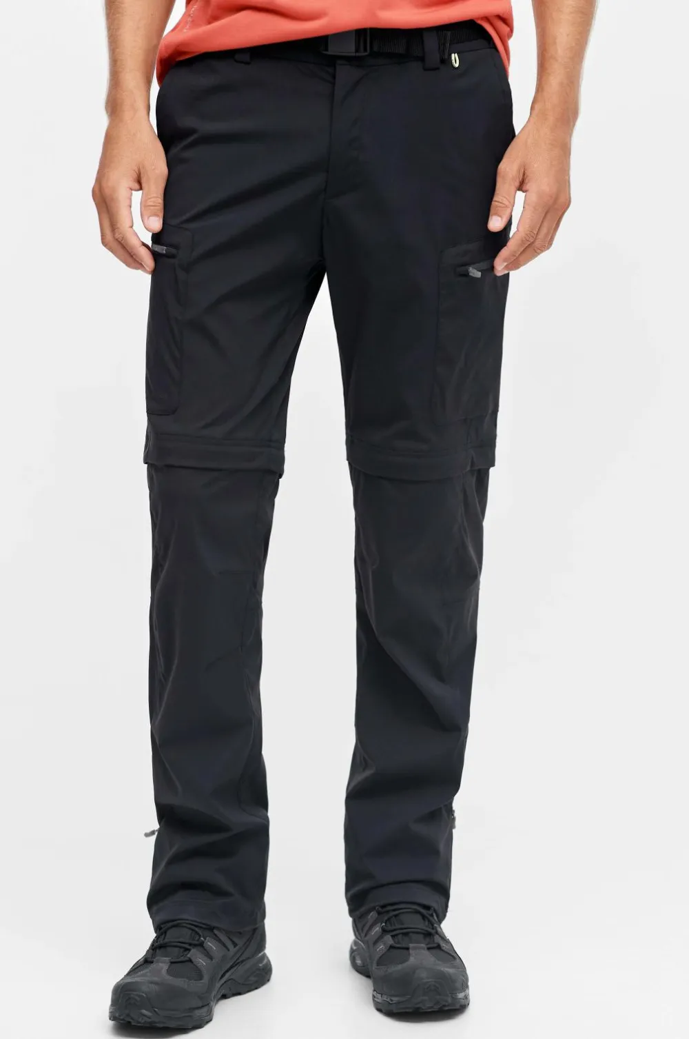 Linningen har et vævet stofbælte i stropper med spænde af plast, trykknap og gylp med lynlås. To forlommer. To benlommer foran og en baglomme, alle med lynlås. Benene kan lynes af ved knæene, så bukserne bliver til shorts. Løbegang med stop i benkant. Benkanten kan åbnes med lynlås. Indvendig benlængde ca. 83 cm i str. M.