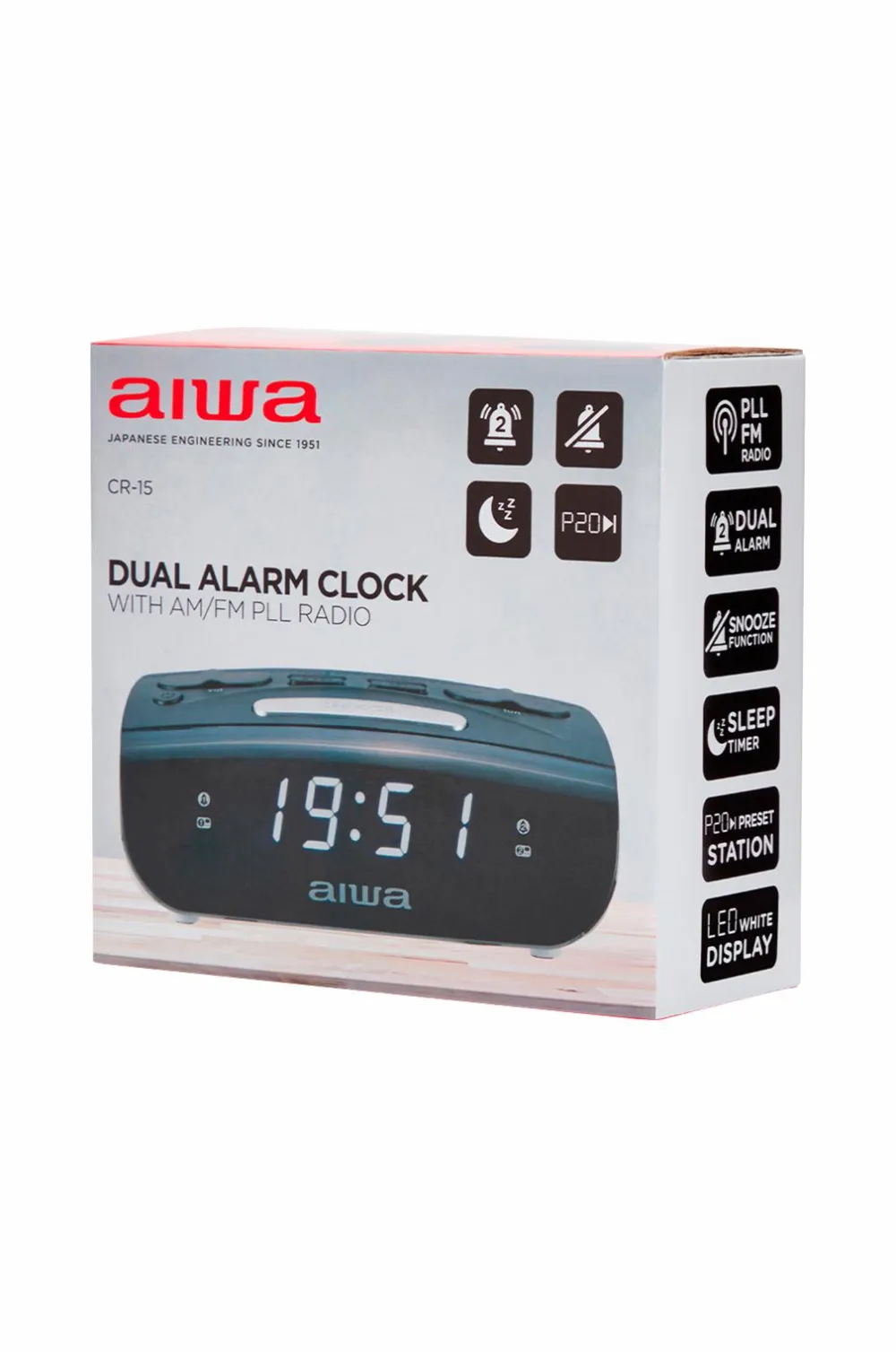 Clockradio i et kompakt design med et 0,6″ hvidt LED-display. Den har en MW/FM PLL-tuner med 20 forudindstillinger og en dobbelt alarm med snooze- og sleep-funktion.