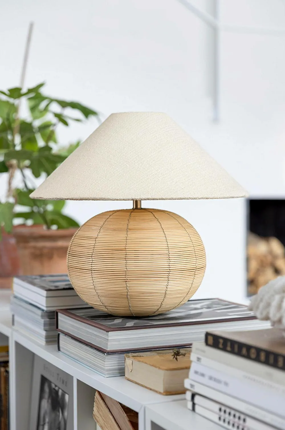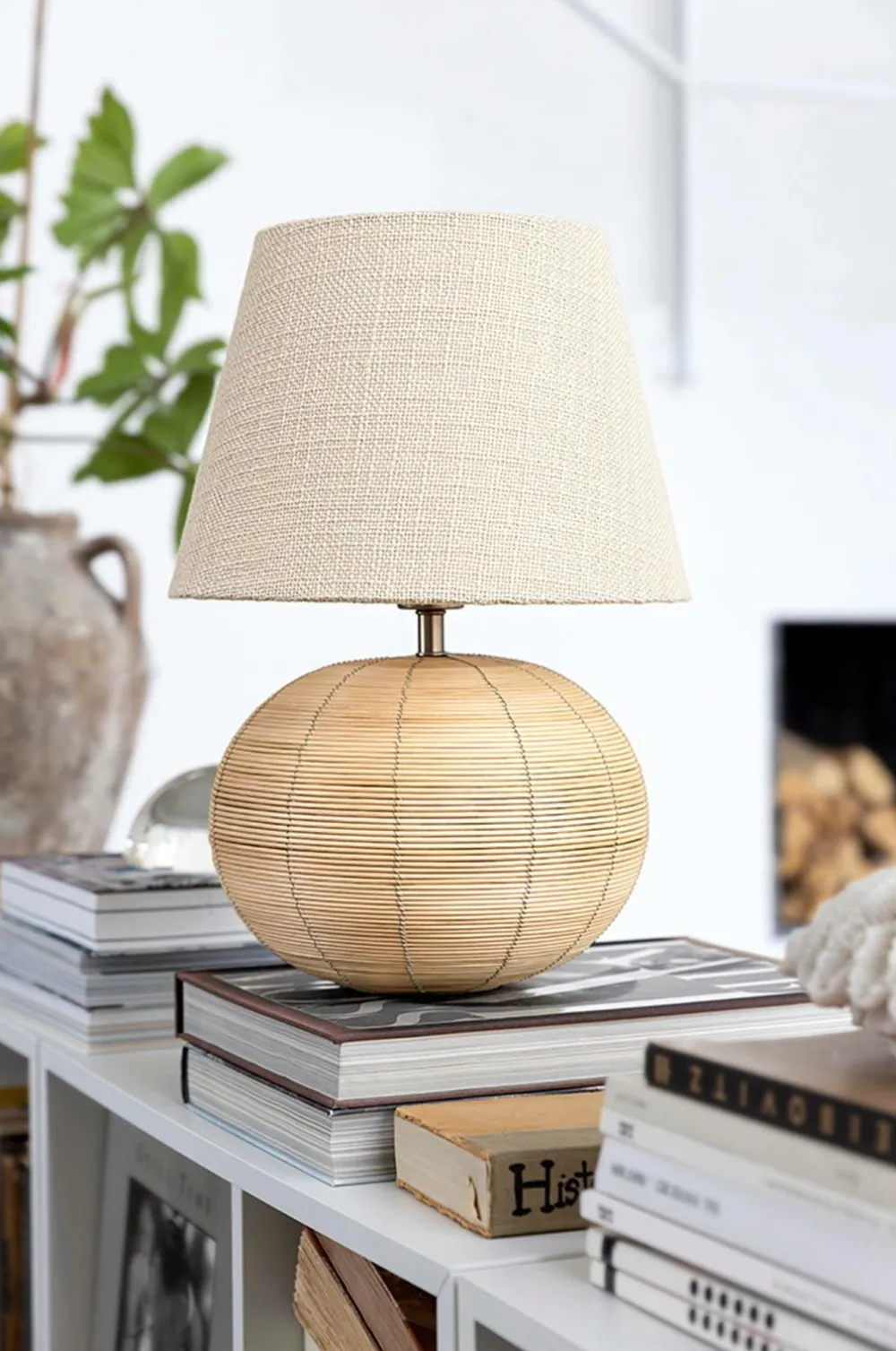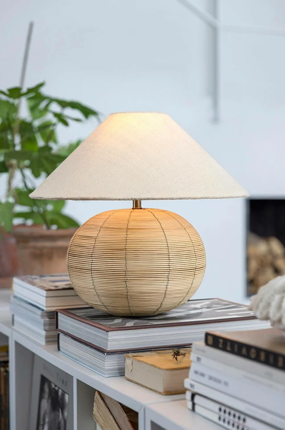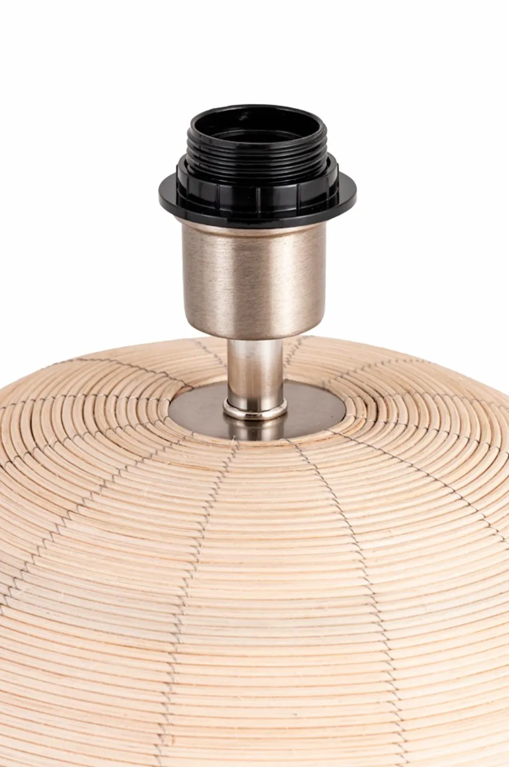 Kugleformet bordlampefod af rattan. Rattan-trådene er ubehandlede og har en lys naturlig farve.