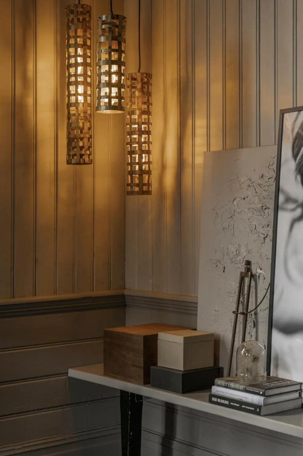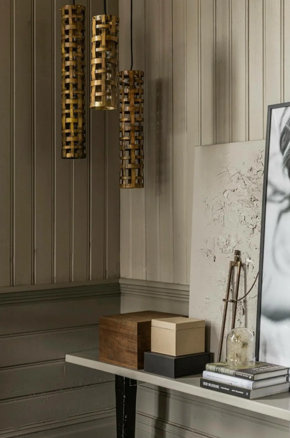 Kolonn-loftslampen er lavet af “flettede” metalstrimler. Sælges komplet med loftsophæng. Fås i tre størrelser, som kan hænges sammen i en gruppe på tre eller enkeltvis. Det er en loftslampe, der giver et smukt og dekorativt lys, og frem for alt spreder den et smukt skyggebillede i rummet. Ved at vælge forskellige lyskilder kan man skabe helt forskellige lysbilleder med denne lampe. Passer i et vindue, over en bardisk i et køkken eller til at hænge i grupper over et sofabord. Ledning/ophæng medfølger ikke og kan suppleres med loftsstik 2249813 fra Alde & Lind, som fås i flere farver.