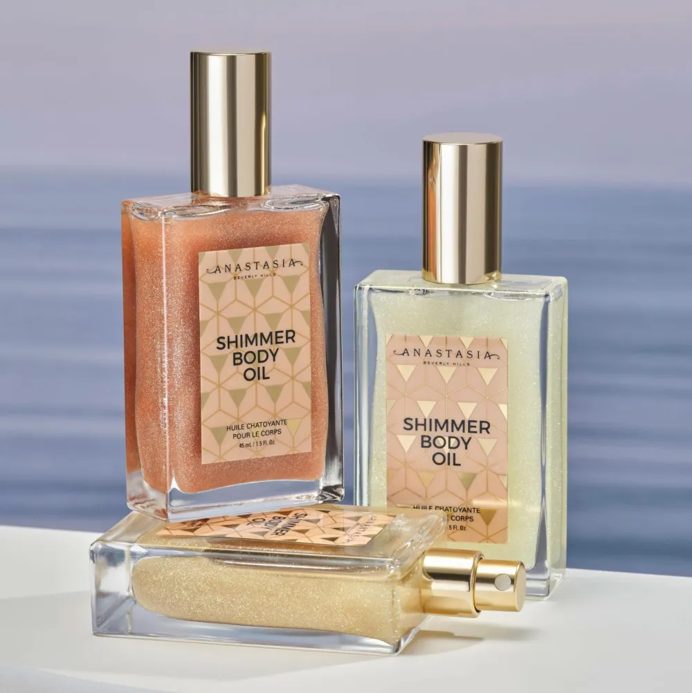 Anastasia Beverly Hills Shimmer Body Oil er en luksuriøs, let kropsolie, der giver huden en solkysset glød og en fugtet fornemmelse. Den luksuriøse letvægtsformel lægger sig glat på huden og efterlader den med en silkeblød fornemmelse (aldrig fedtet). Denne antioxidantrige formel indeholder jojobafrøolie og sød mandelolie, som tørrer ind på et øjeblik og efterlader huden med et smukt, strålende skær, der lyser op. Den udsender en superfin tåge, der lægger sig vægtløst på huden og har en delikat duft af kokosnød og vanilje.