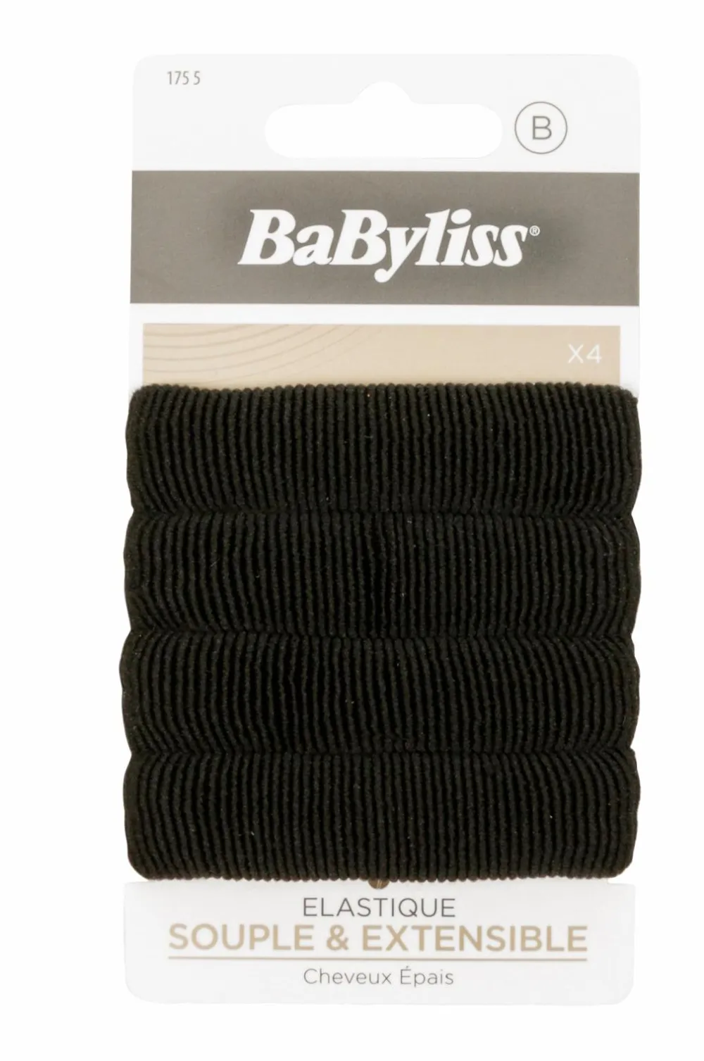 Tykke, bløde hårelastikker. 4 stk. pr. pakke. Sorte. Passer til lidt tykkere hår.
