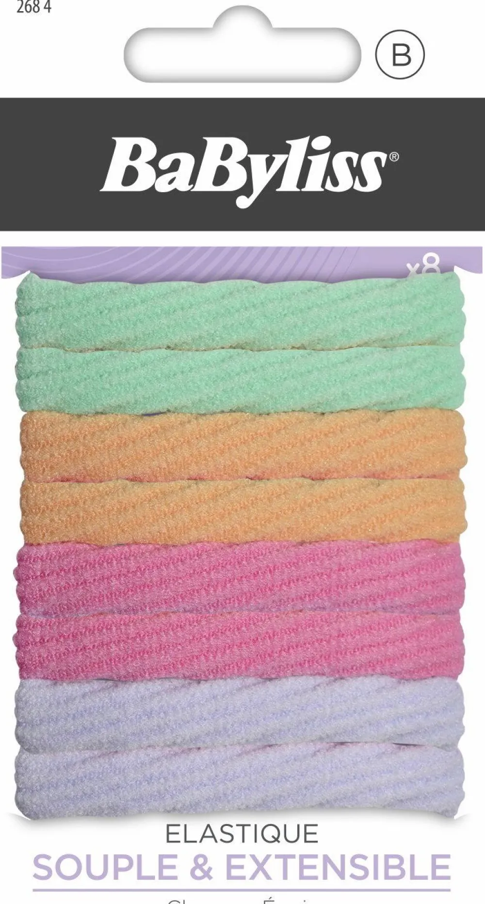 8 bløde, fleksible hårbånd i fire farver pr. pakke; pink, grøn, lilla, gul. Brug dem til enkle hestehaler eller til mere avancerede frisurer og opsætninger.