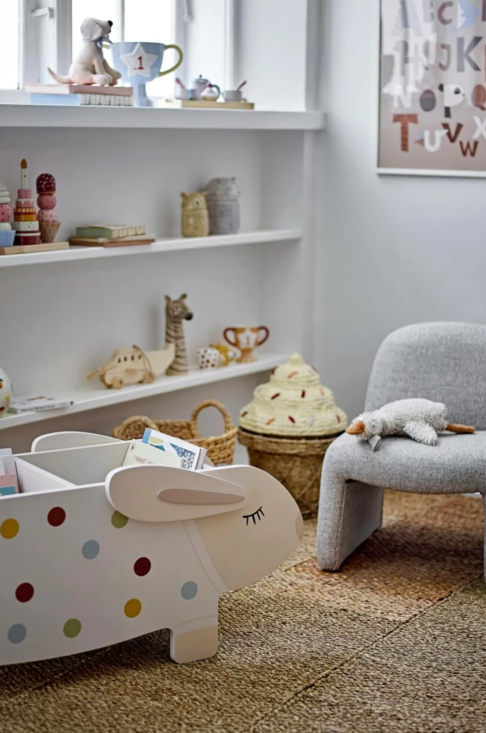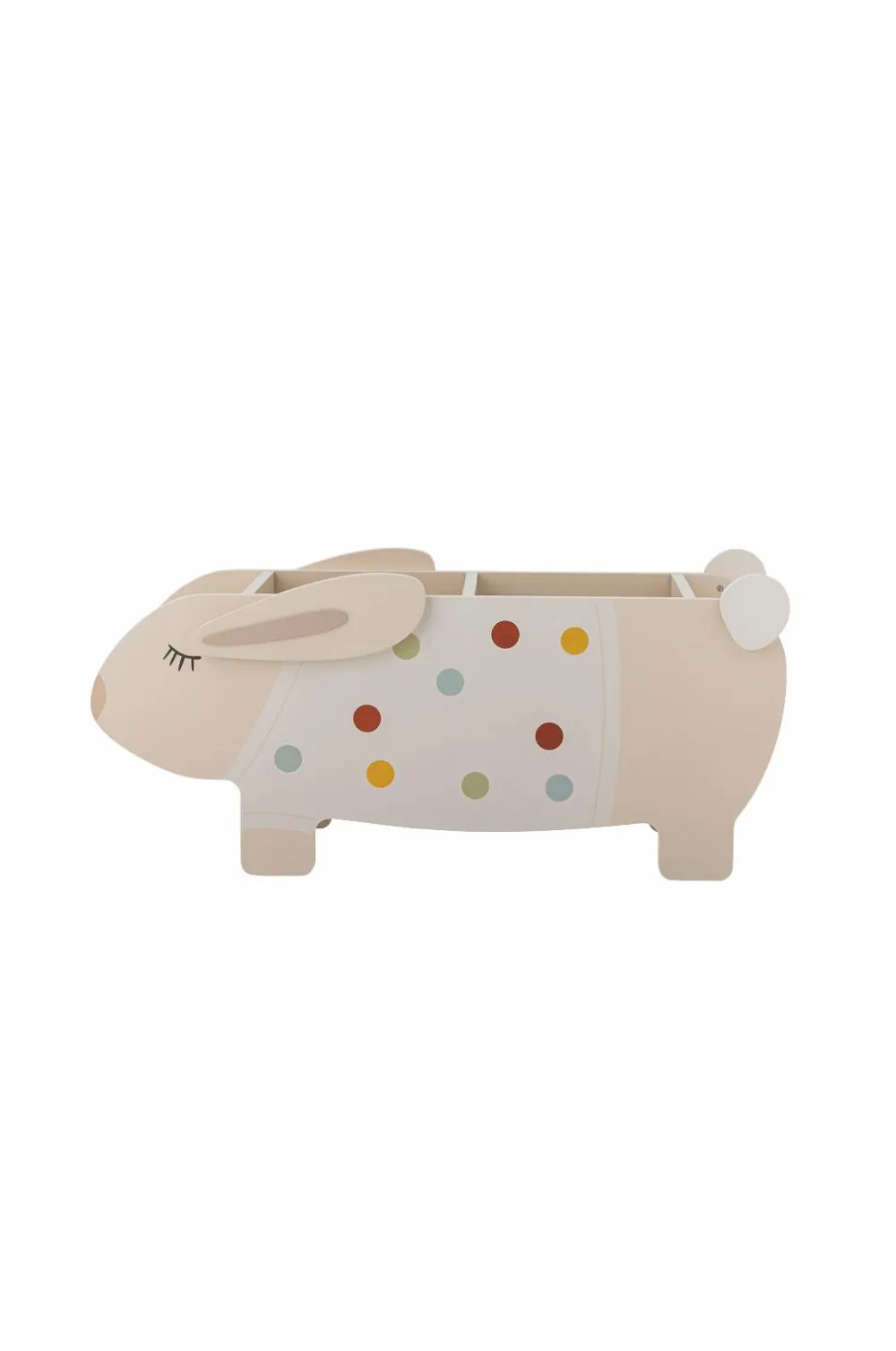 Villja-reolen fra bloomingville mini ligner en sød kanin iført en prikket sweater. Den er lavet af mdf og har hylder og rum, der er ideelle til opbevaring af bøger og legetøj på børneværelset.
