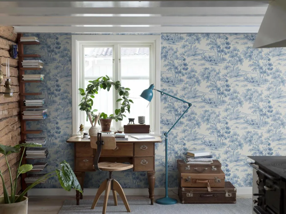Tapetet Countryside Morning prydes af et frodigt landskab med hjorte, der græsser i de tidlige morgentimer. Figurative landskaber som dette kaldes normalt toile de jouy. Hver rulle er 10,05 m. Bredde 53 cm. Forskudt mønsterrapport 53 cm. Printet i Sverige på et non-woven materiale. Tapetet er Easyup-mærket, hvilket betyder, at du påfører limen direkte på væggen, og du behøver ikke grunde først.