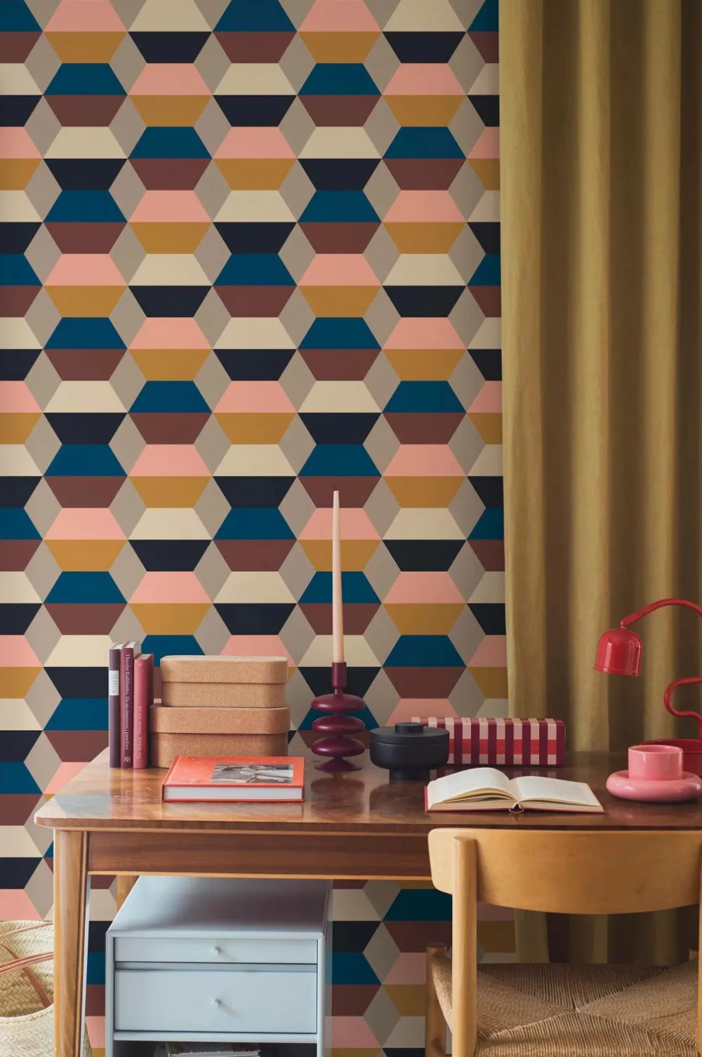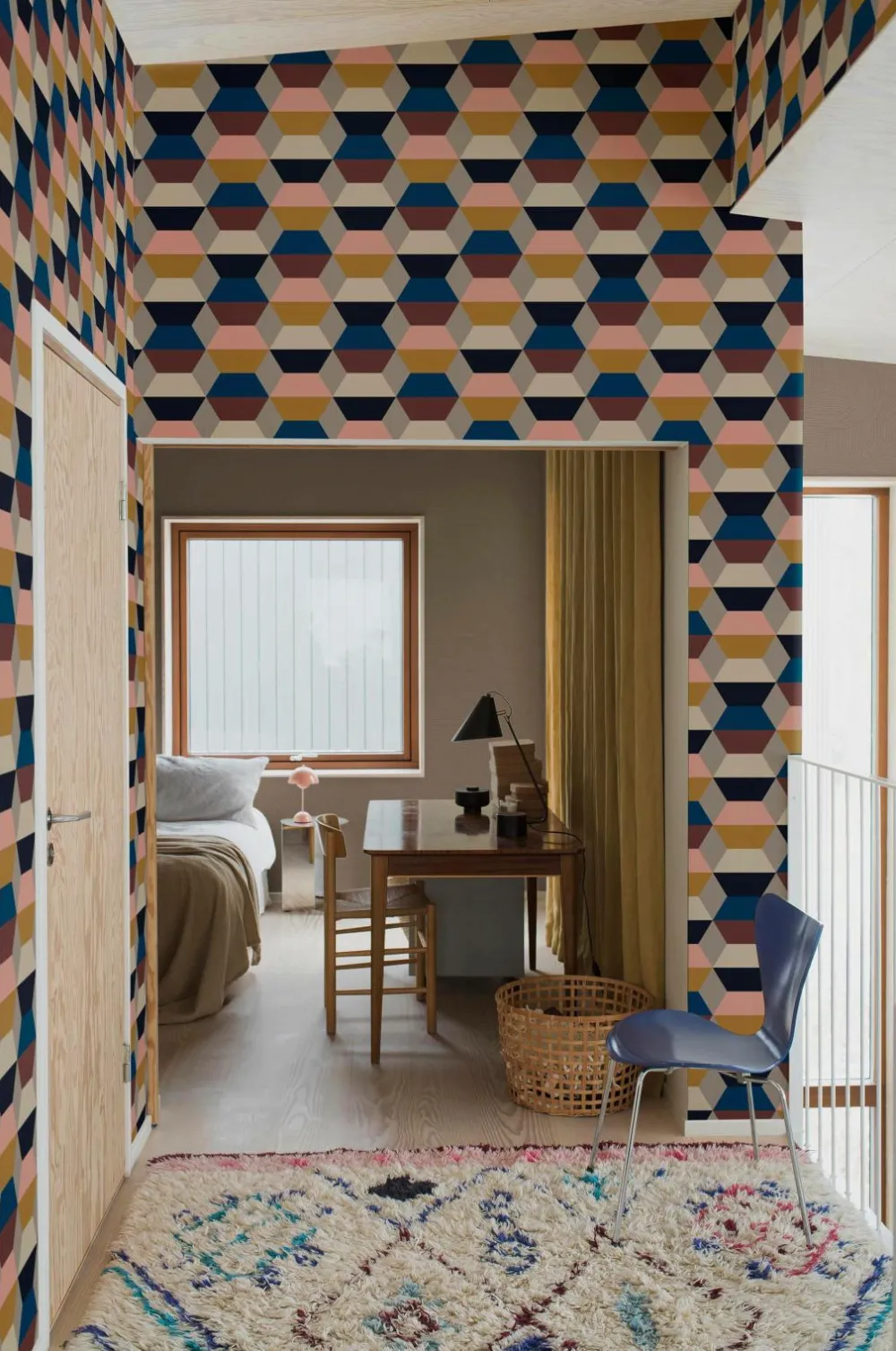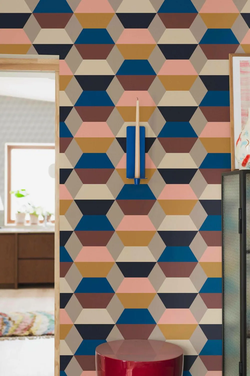 Tilføj en dynamisk og tidløs stil til dit hjem med vores prisma tapet. Med et dristigt geometrisk mønster af todelte sekskanter i flerfarvede varme og kølige toner giver dette tapet et moderne og kreativt touch til dit rum. Hæng prisma tapet op i din stue, spisestue eller køkken for at få et seriøst stilfuldt udtryk. hver rulle er 10,05 m. Bredde 53 cm. Mønstergentagelse på 53 cm, lige match. Fremstillet i Sverige på et ikke-vævet materiale. Tapetet er easyup-marked, hvilket betyder, at du påfører limen direkte på væggen, og du behøver ikke at lave nogen grundmaling før.