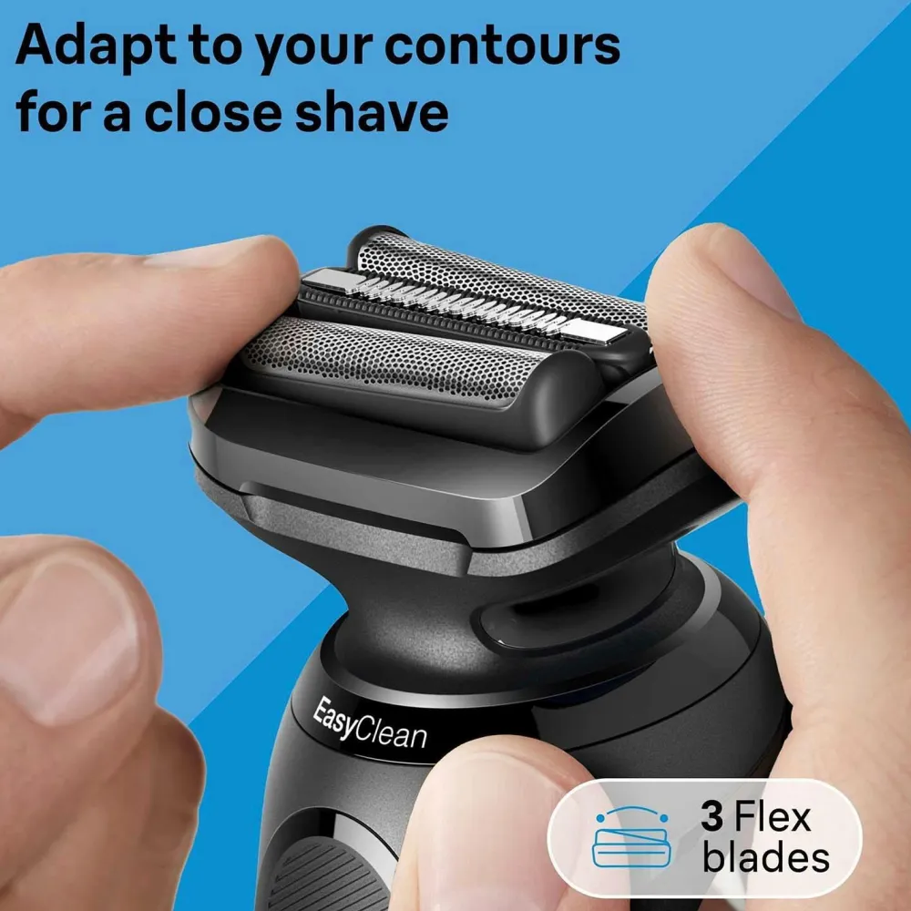 – 3 fleksible blade: Tilpasser sig ansigtets konturer for en tæt barbering og beskytter samtidig huden