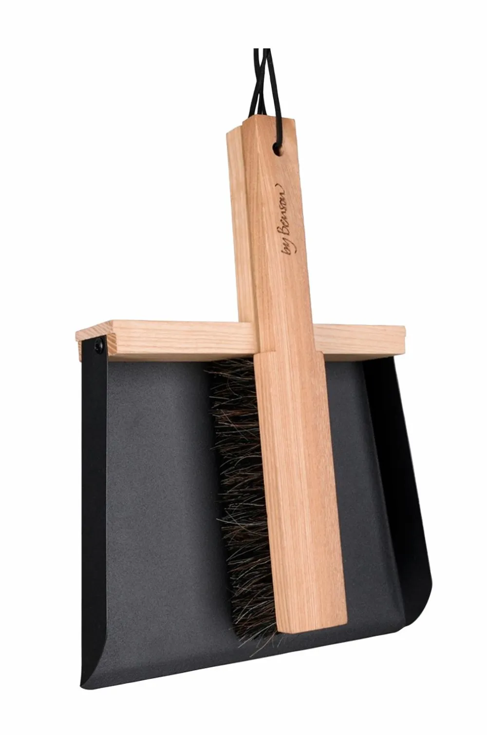Dette kost- og fejesæt kombinerer tidløs svensk design med praktisk funktionalitet. Med håndtag i asketræ, en mat sort metal fejespand og børster lavet af 30 % hesthår og 70 % PET, tilbyder det både holdbarhed og stil.