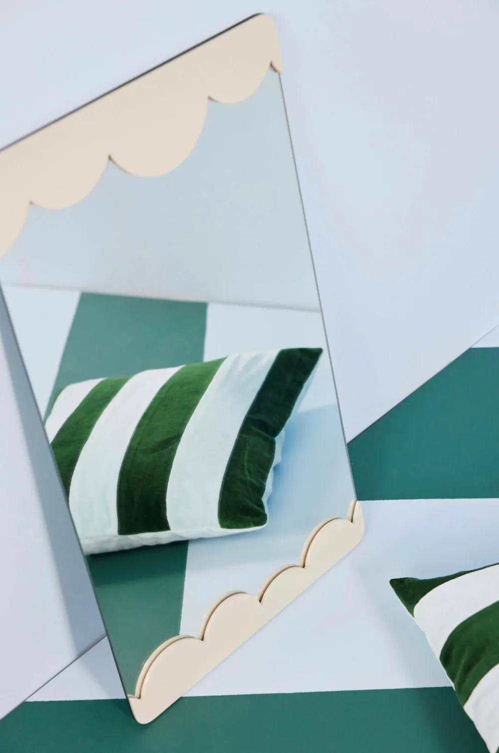 De bløde, afrundede former er tegnet i hånden og skaber legende halvcirkler, der får os til at tænke på luftige skyer. Rammen har et anderledes design, hvor den ikke sidder på den klassiske måde med fire sider, men kun på to af siderne. Rammen er lavet af sprøjtelakeret MDF og har to forskellige ophæng (vandret og lodret) for at kunne variere den måde, den hænges op på. Et spejl, vi absolut vil se i mange hjem for at lyse op i et rum. Fås i beige og bordeaux. Design Byon Studio.