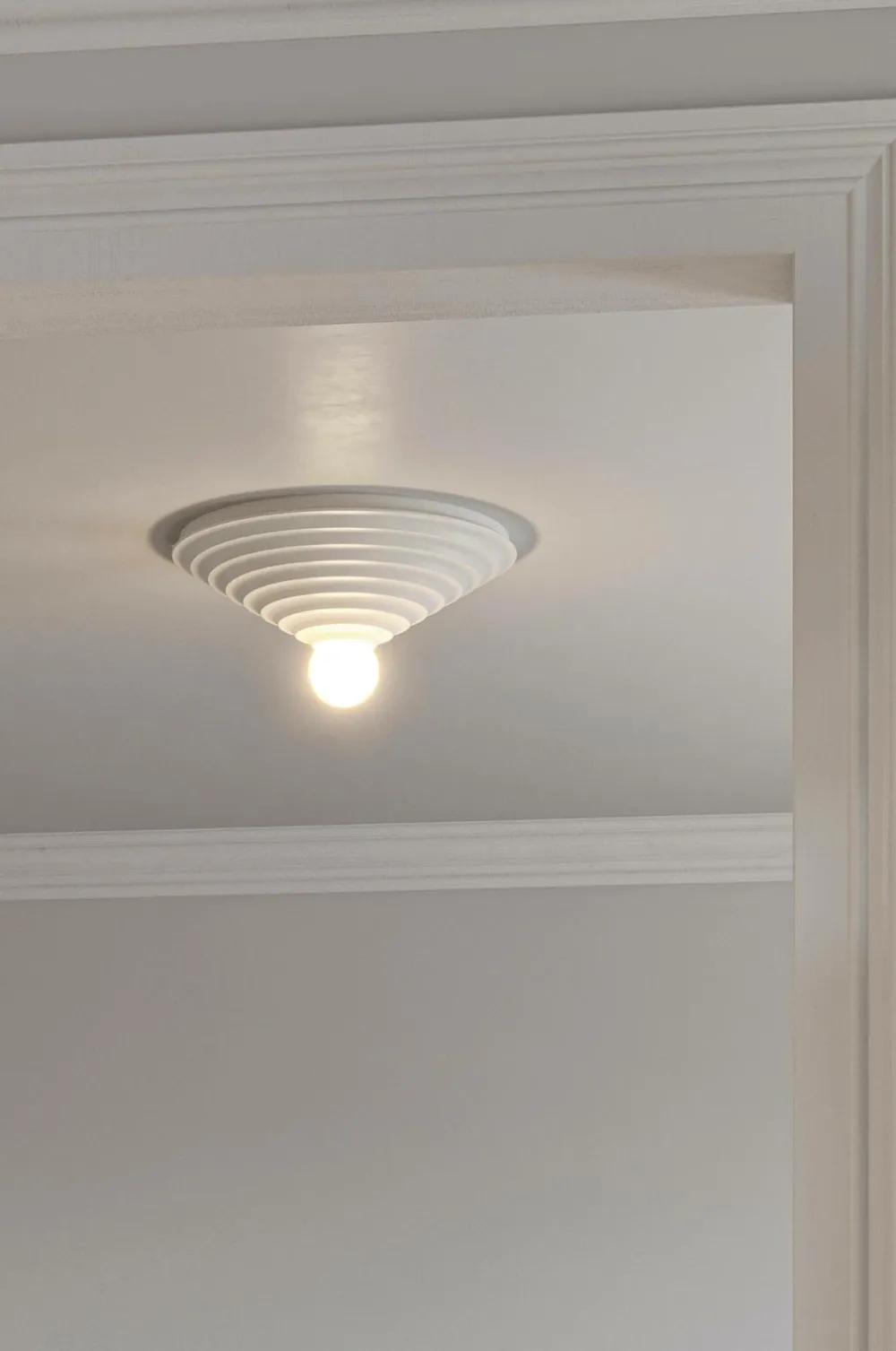 Loop 45 har lighed med en arkitektonisk roset, der bruges til at dekorere lofter i et rum. Brug en større matteret lyskilde, og lampen giver et blødt generelt lys eller en diffus atmosfærisk glød, når den er dæmpet. Den passer perfekt i rum, hvor en hængende loftslampe ikke passer ind. Meget nem at installere med et krogophæng. Designet af monika mulder. Pære og loftsstik medfølger ikke.