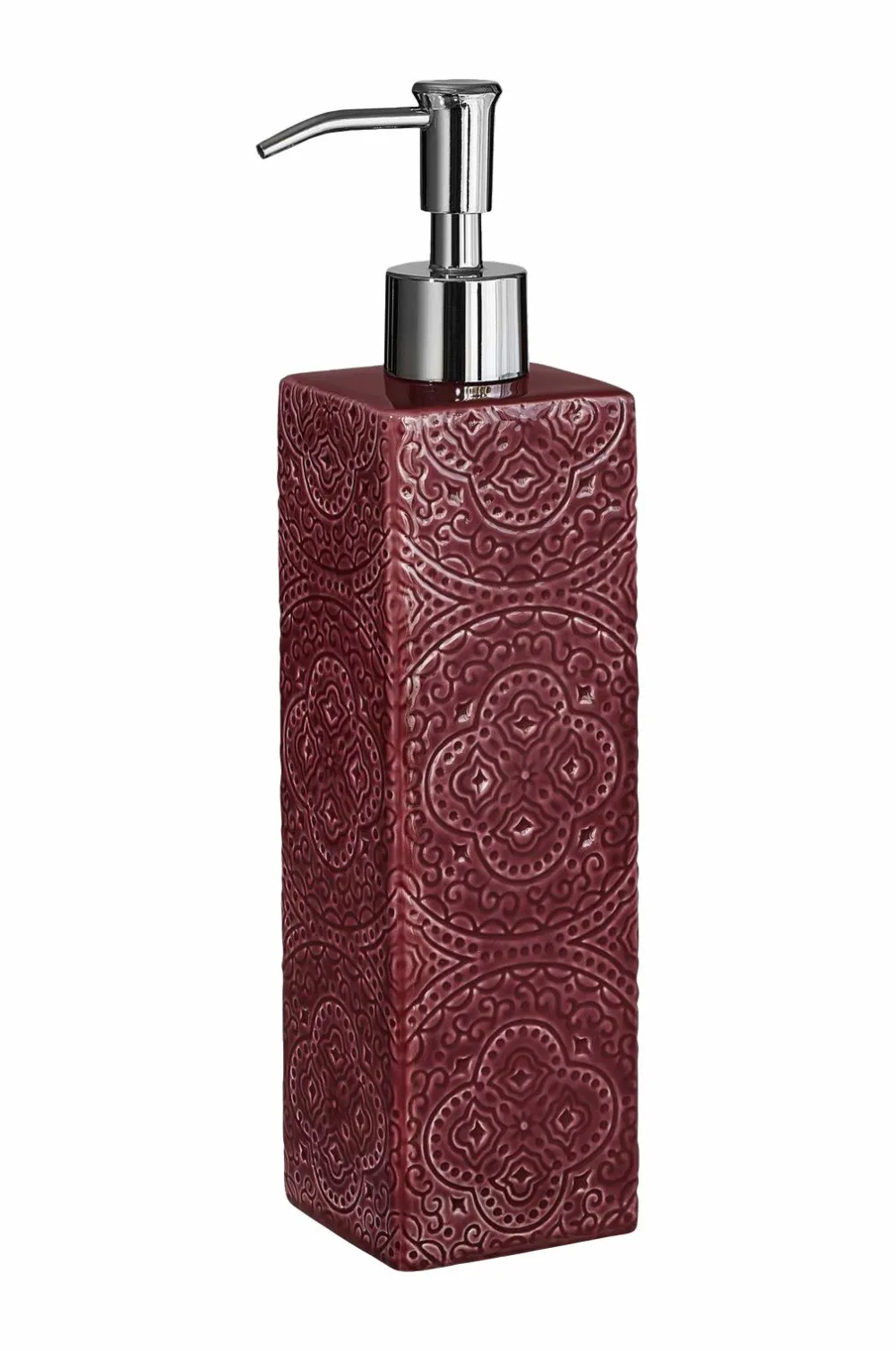 Keramisk sæbepumpe med smukt reliefmønster. Dette er en dekorativ og funktionel genstand designet af Marita Lord , der er kendt for at skabe hverdagsprodukter med fokus på keramiske materialer. Reliefmønsteret giver den praktiske sæbepumpe et kunstnerisk præg.