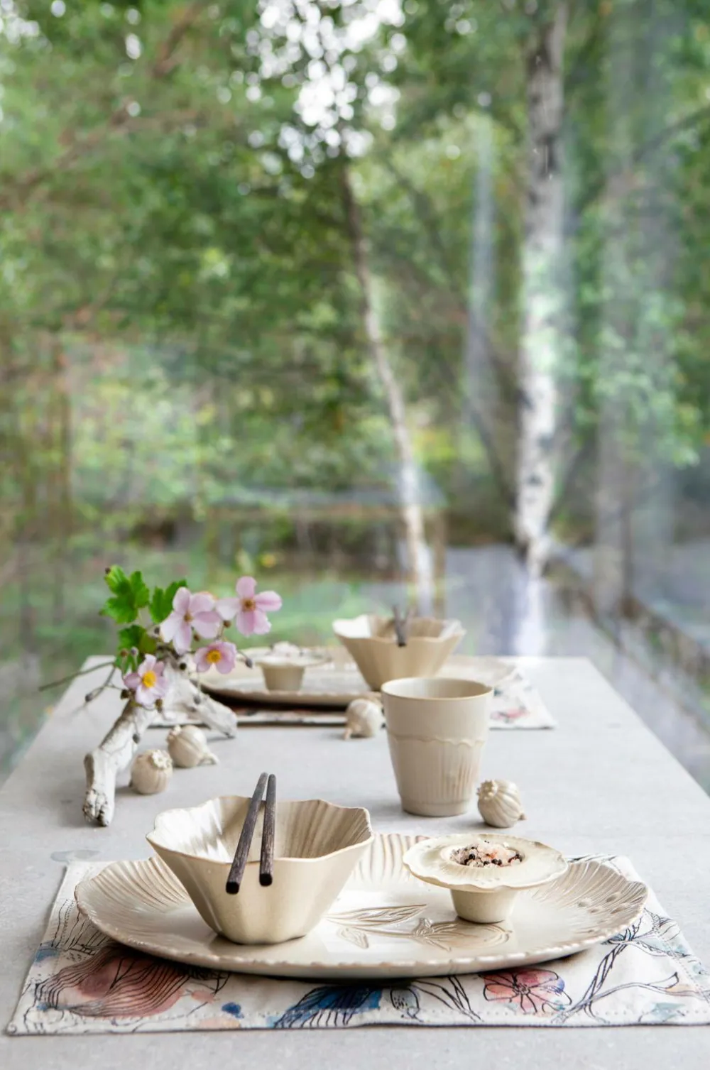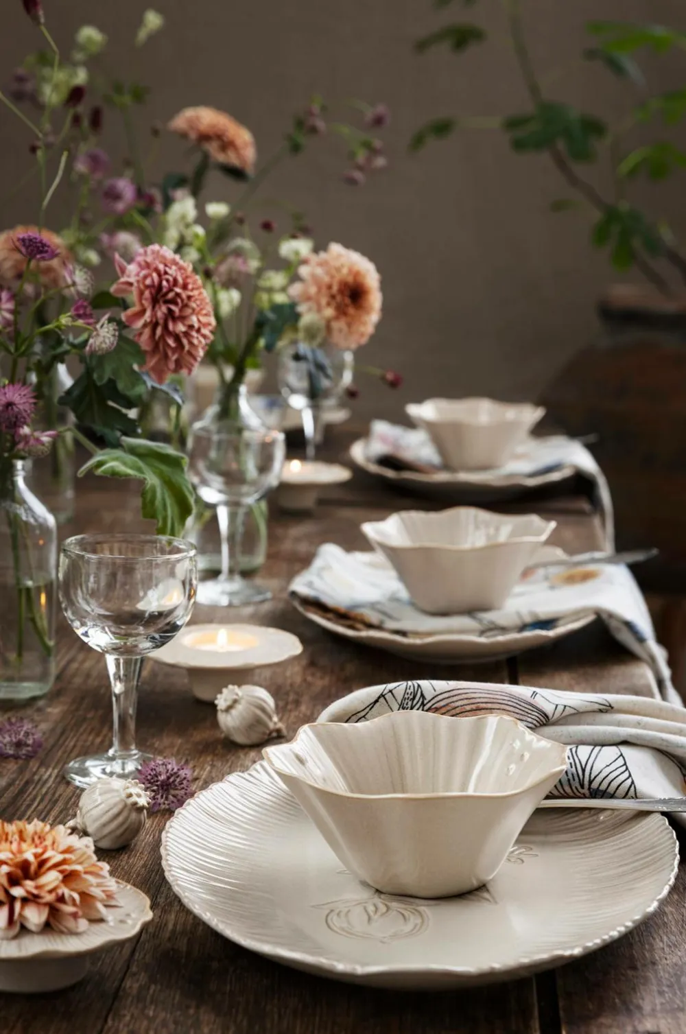 Lysestage i smuk reaktiv glasur med reliefmønster. Fremstillet af holdbart stentøj. Designet af Maria Söderberg