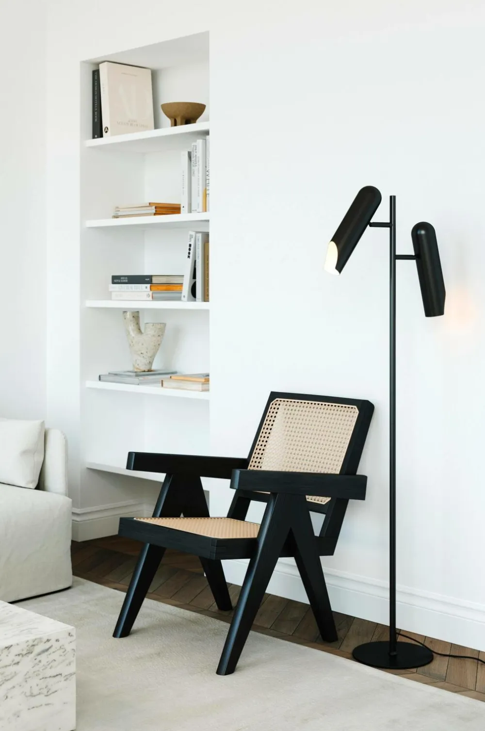 Rochelle-serien af den danske designer Charlotte Høncke har et moderne italiensk formsprog med to slanke, skulpturelle lampehoveder. De justerbare lampehoveder kan rettes, som man vil, hvilket gør lampen perfekt til arbejde eller læsning.