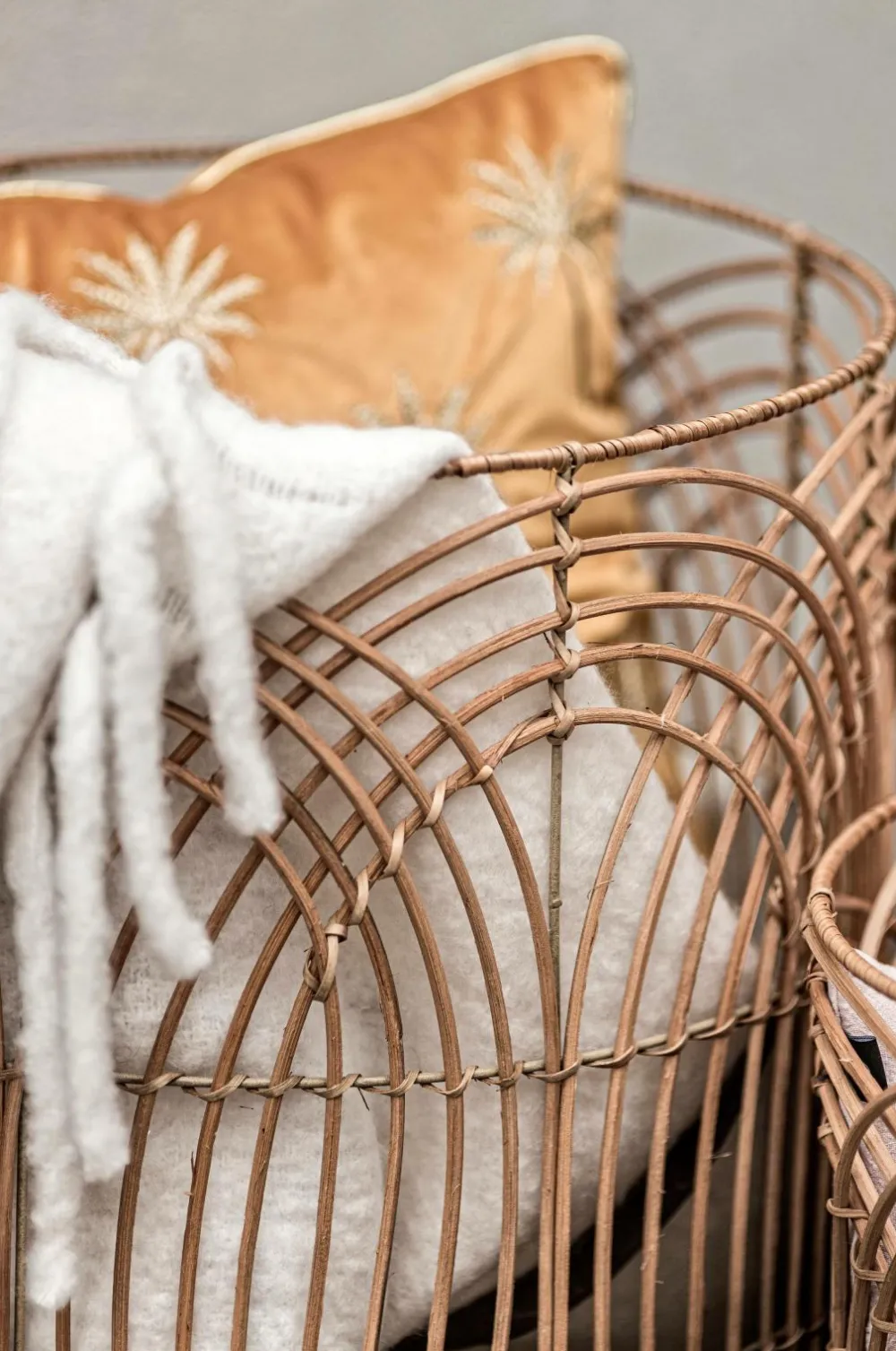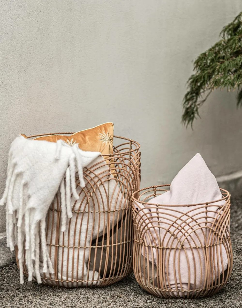 Kurve i rattan, 2 dele, højde 50 cm og 35 cm. Tørres med tør klud. Hvert produkt er unikt og håndlavet. Maks. kapacitet, stor kurv 12 kg, lille kurv 8 kg.