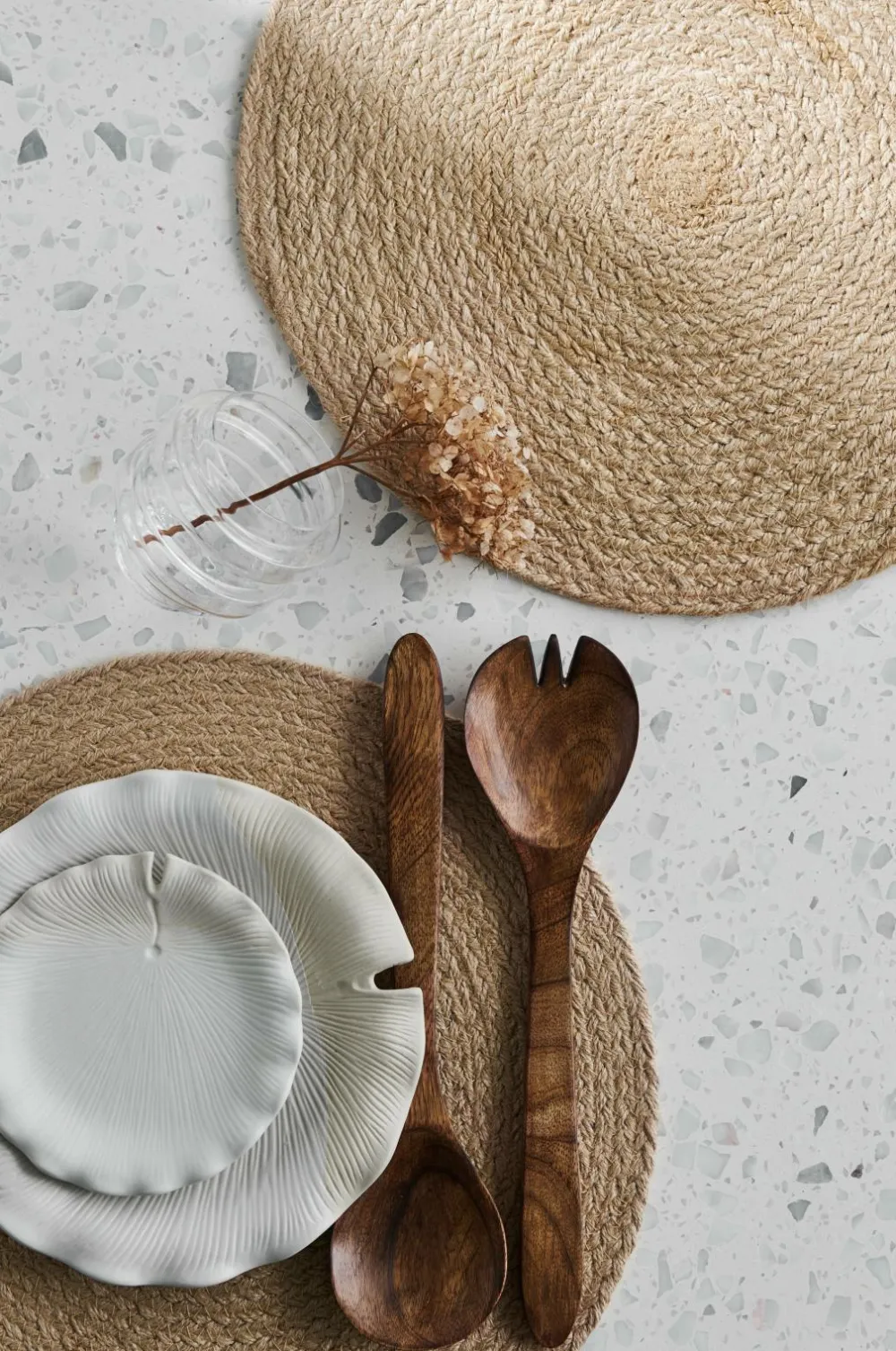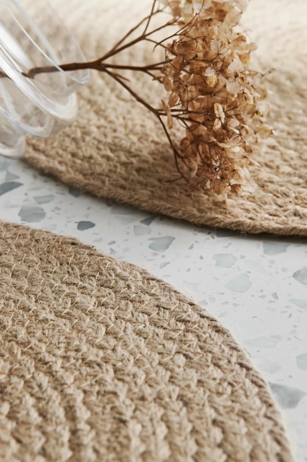 Runde dækkeservietter i 4-pak af flettet jute i blød kvalitet. Ø 38 cm.