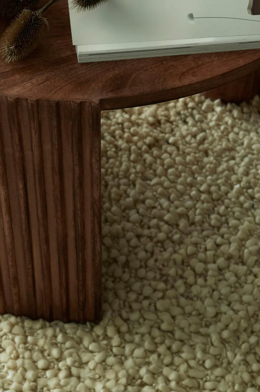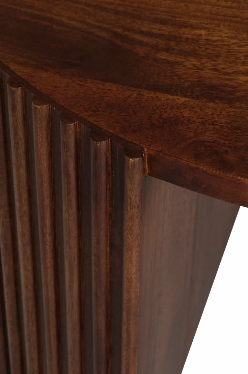 Sofabord i mangotræ. Understel med riflet struktur og et rundt, kraftigt ben. Højde 45 cm, diameter 80 cm. Samlet.