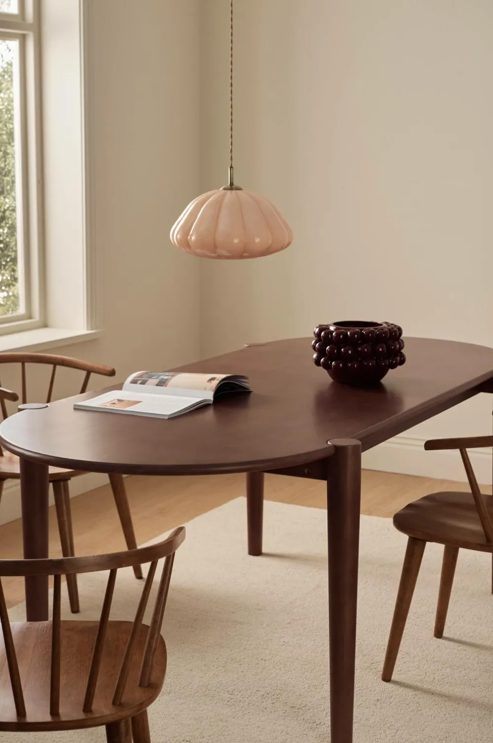 • Ovalt spisebord i massiv, bejdset fyrretræ