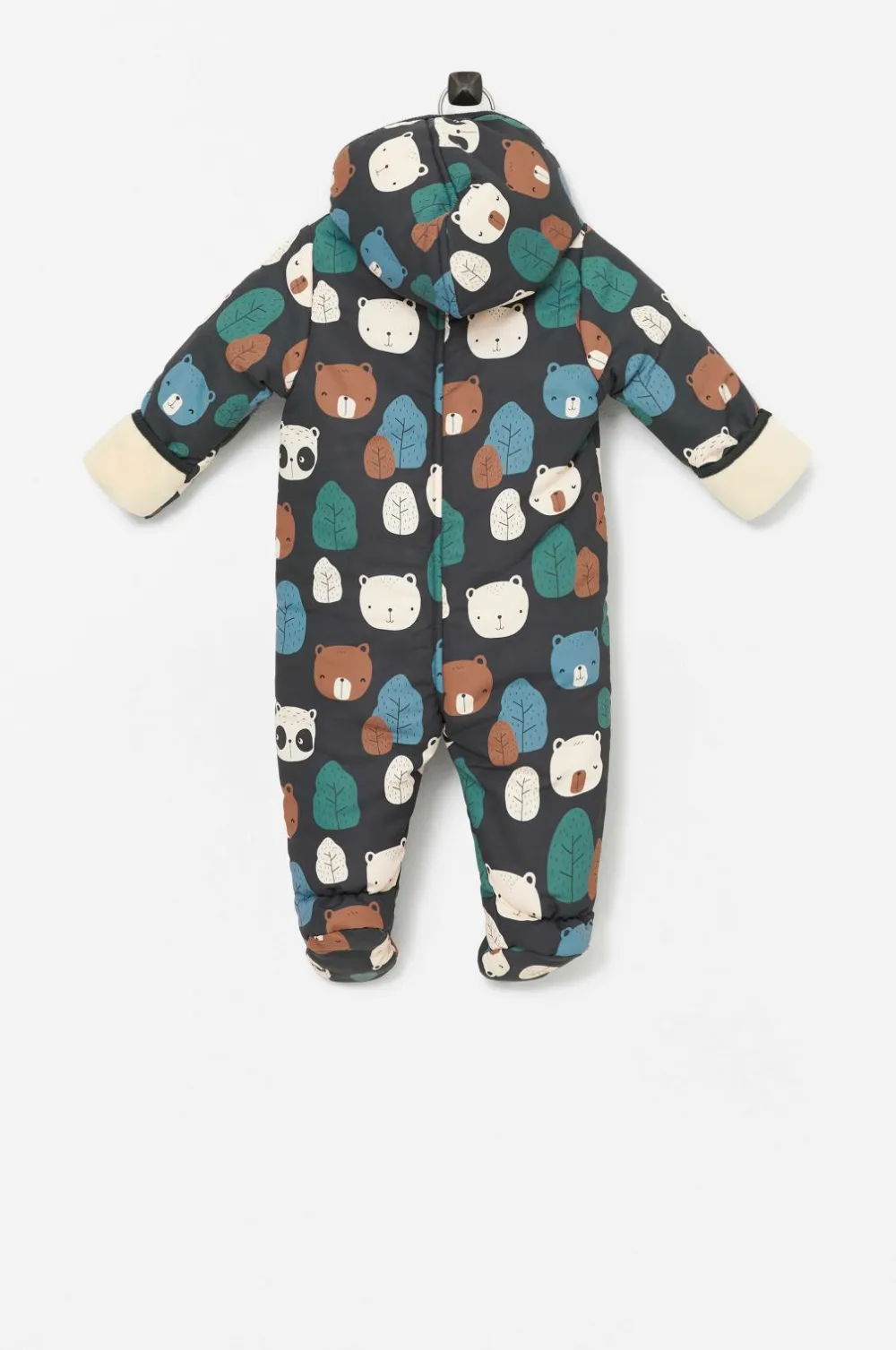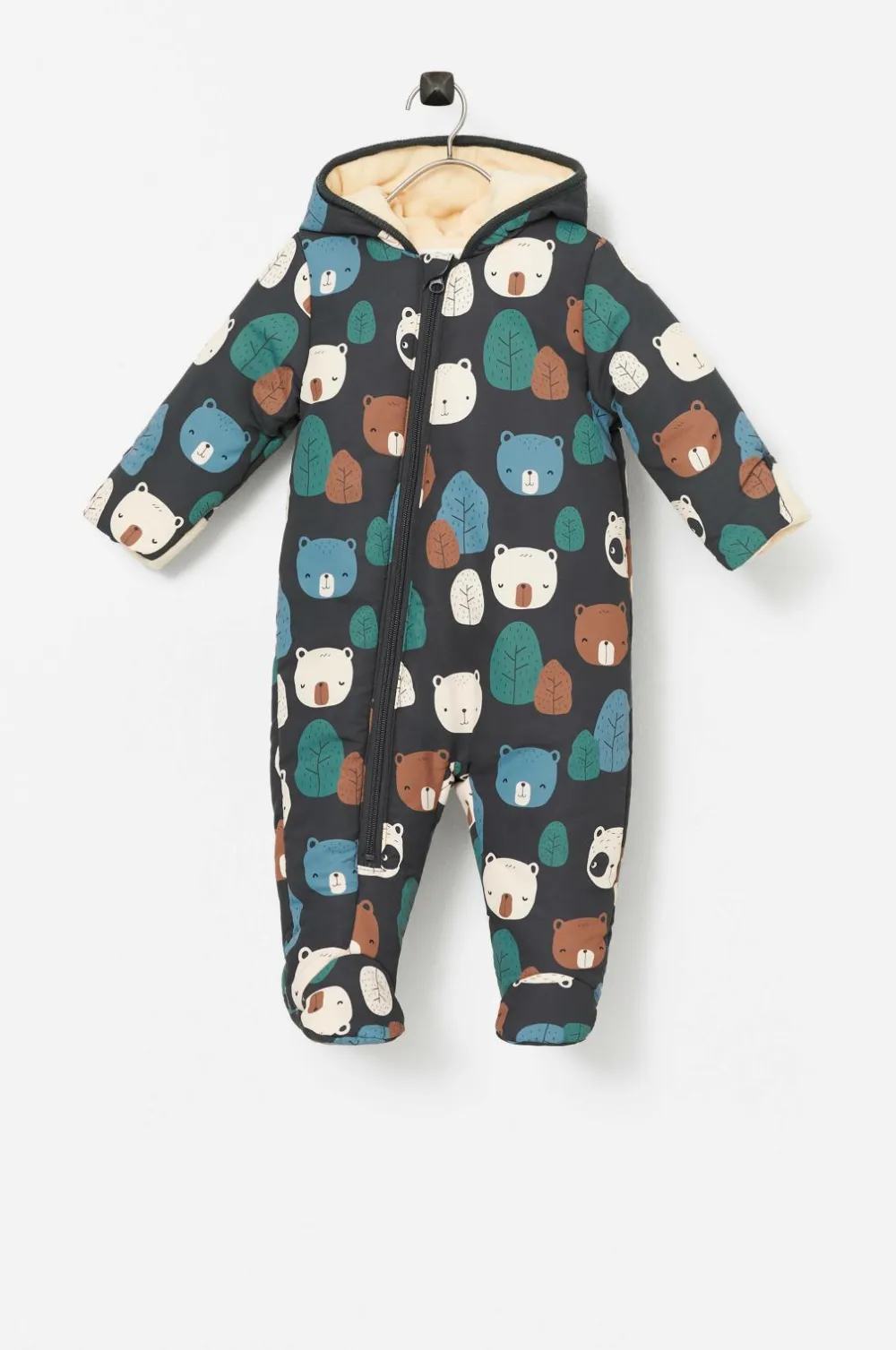 Varmt vatteret dragt med hætte, opslag i ærmekanterne og hel fod. For i blød plys og glat, vævet for i ærmerne. Fast, plysforet hætte. Lynlås som går ned i det ene ben.