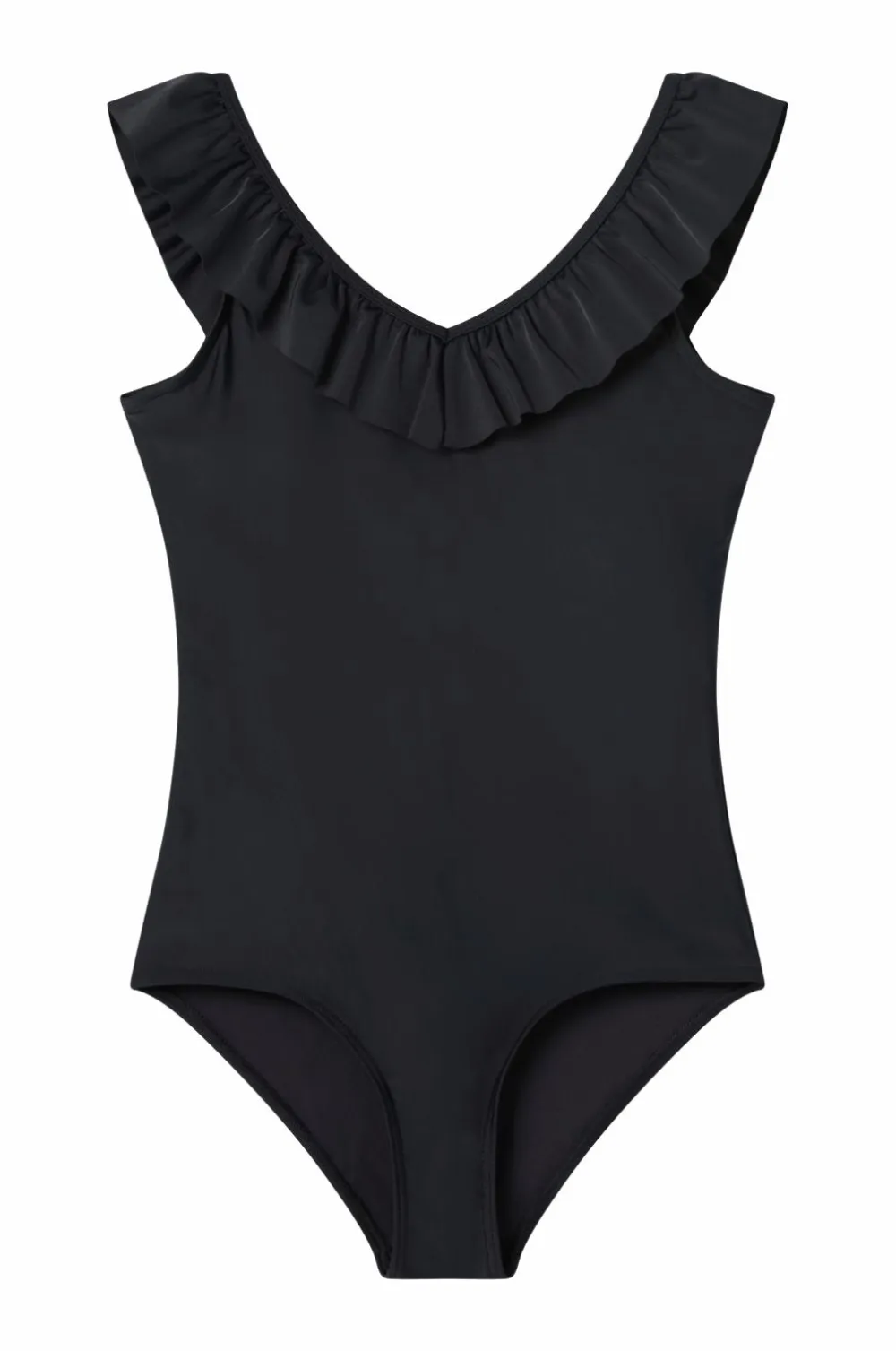 • V-formet volant rundt om halsudskæringen og på skulderstropperne