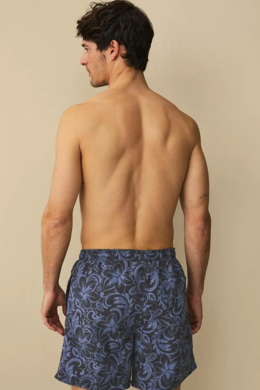 • Lange badeshorts i polyester med elastisk talje og træksnørre