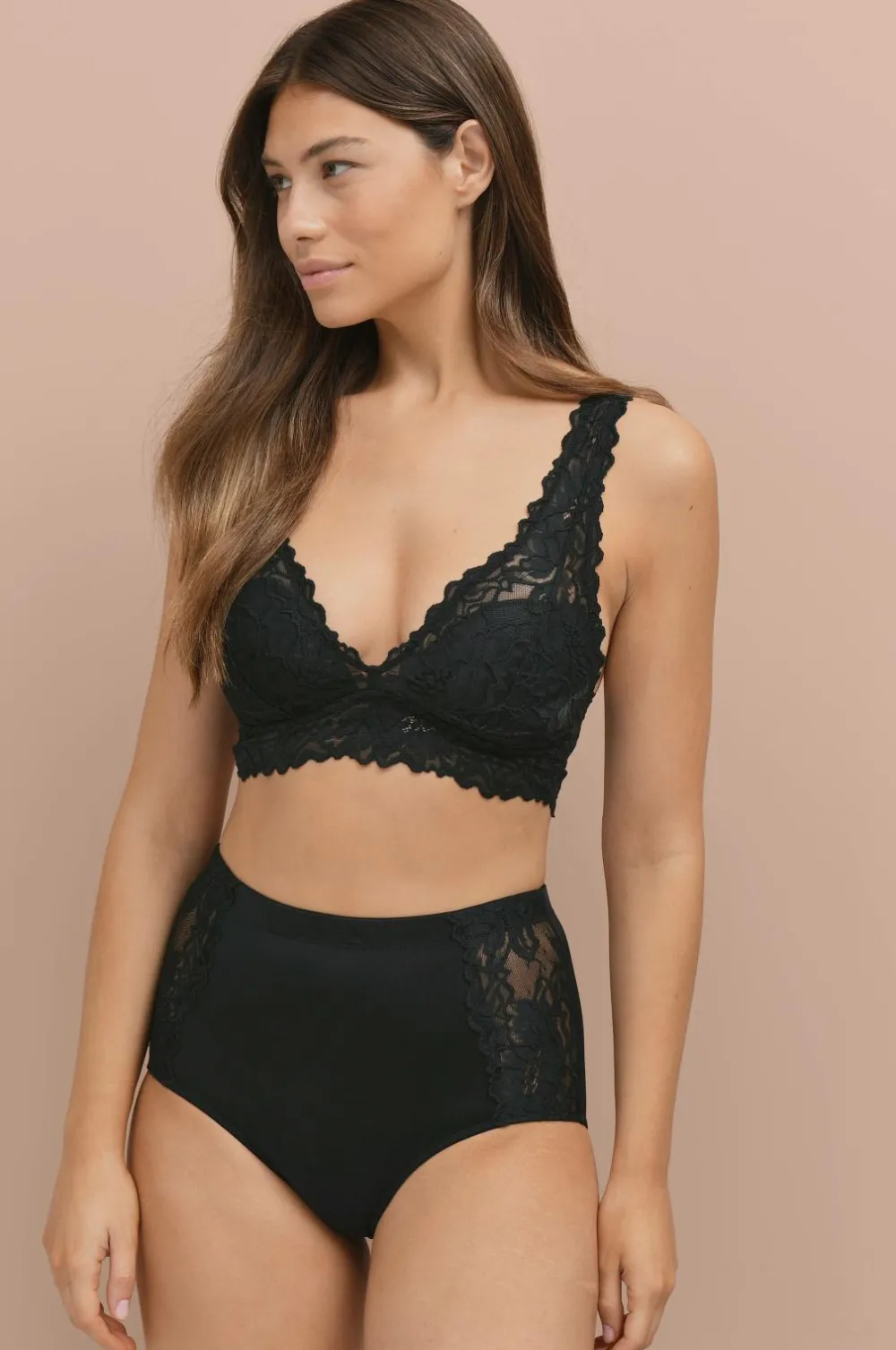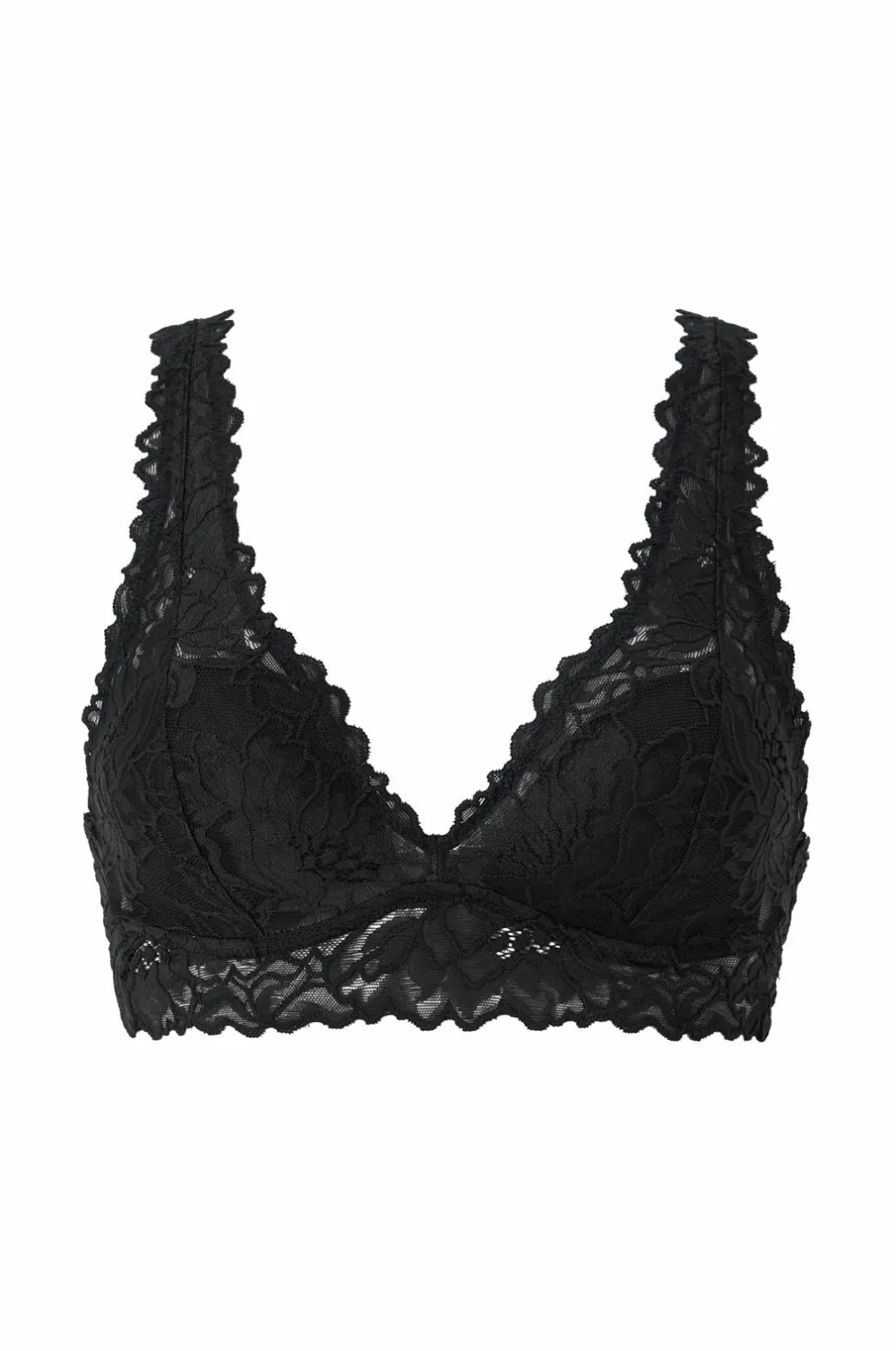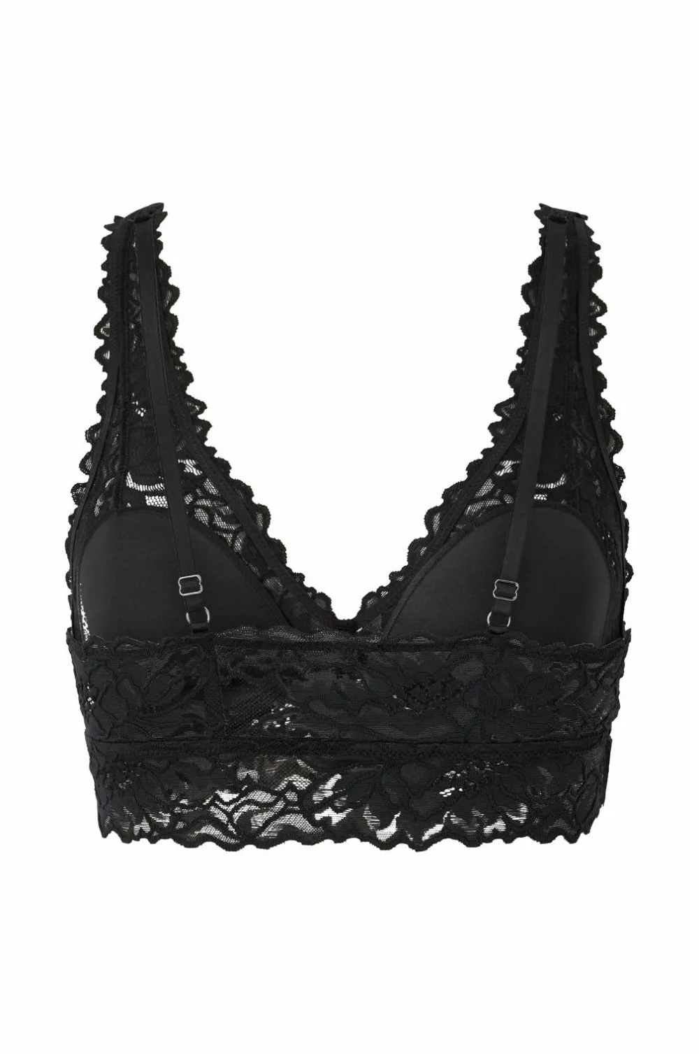 Blonde-bh med trekantede skåle med fast, tynd vattering. Bred blonde forneden. Justerbare skulderstropper. Ingen knaplukning bagpå.