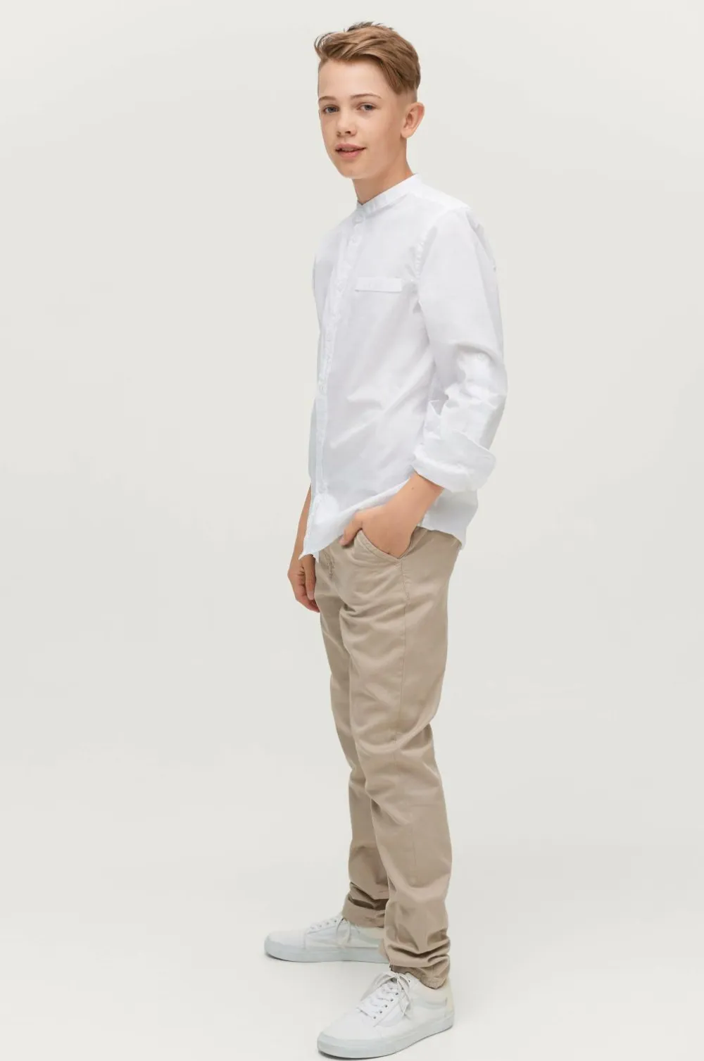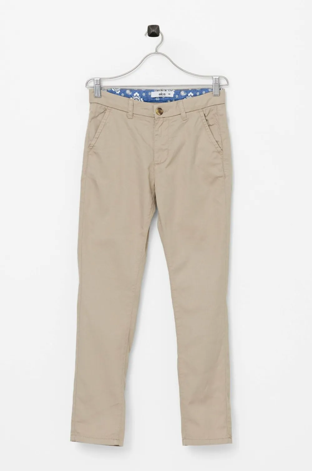 Chinos Sloane med lommer i siderne og paspolerede lommer med knap bagpå. Gylp med lynlås og knap. Justerbar talje med indvendig knapelastik. I vævet kvalitet.