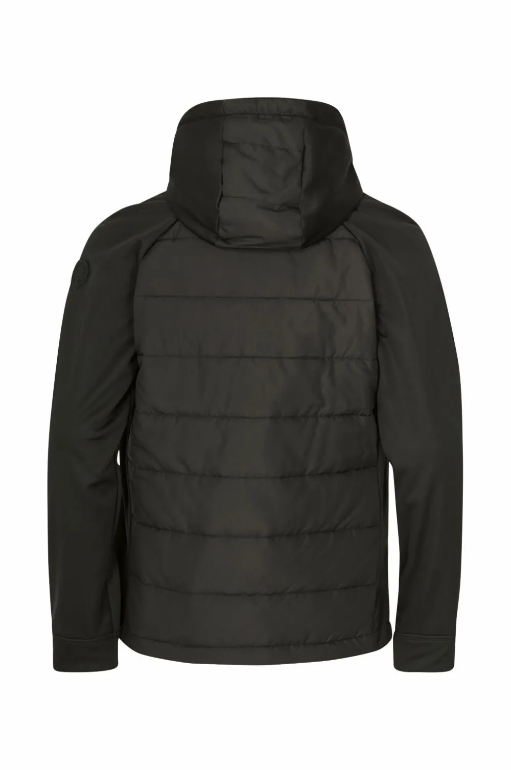 Hybridjakke med ærmer og sider i softshellmateriale med blød, børstet inderside. Quiltet og vatteret stof foran og bagpå samt på hætten. Fast hætte med løbegang. Lukning med lynlås. To lommer med lynlås og to åbne inderlommer. Længde ca. 70 cm i str. M.