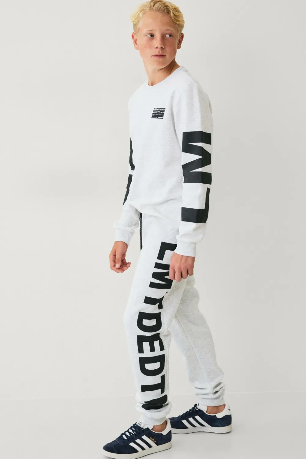 • Sweatbukser med tryk på det ene ben og blød børstet inderside
