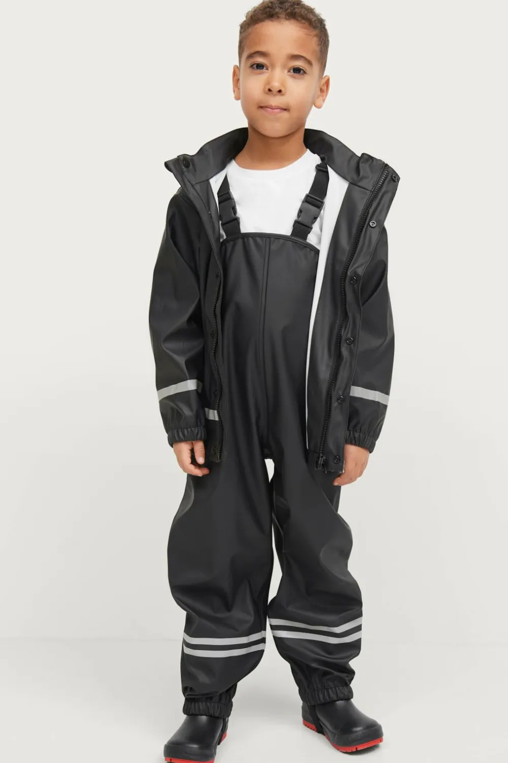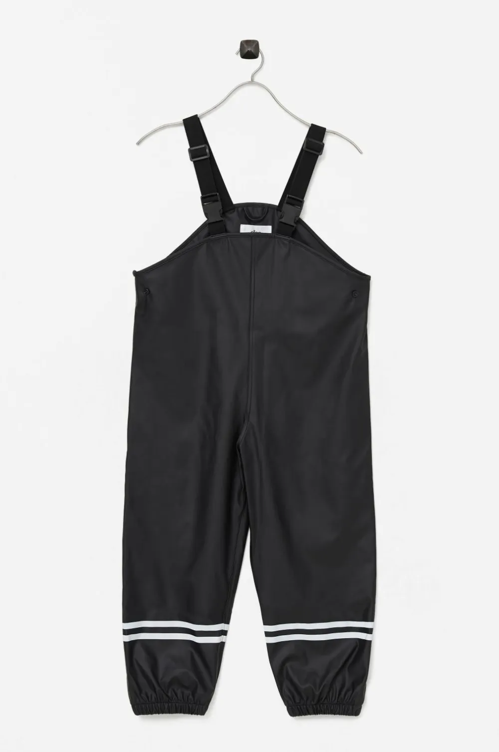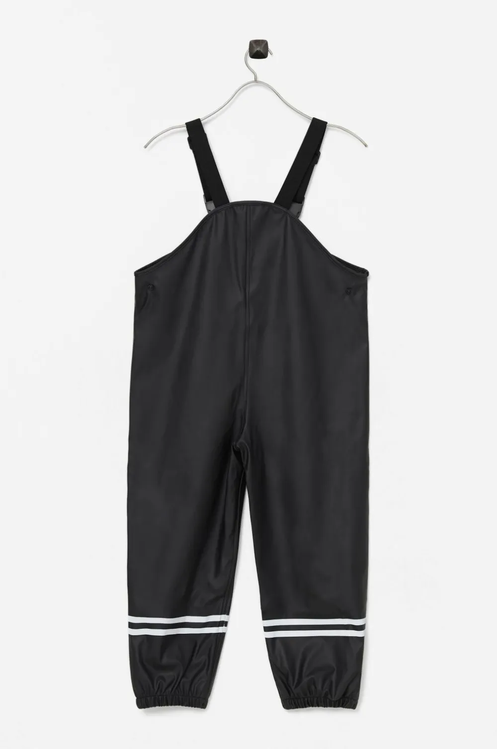 Uforede regnbukser i vandtæt gummikvalitet. Justerbare seler og regulerbar vidde foroven med trykknapper i siderne. Indsat elastik i benkant. Aftagelige, elastiske fodstropper. Striber i refleksprint på benene.
