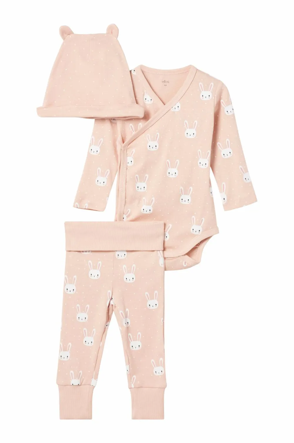 Startpakke eller gavesæt i 3 dele til babyens første tid. Blød økologisk bomuldsjersey.