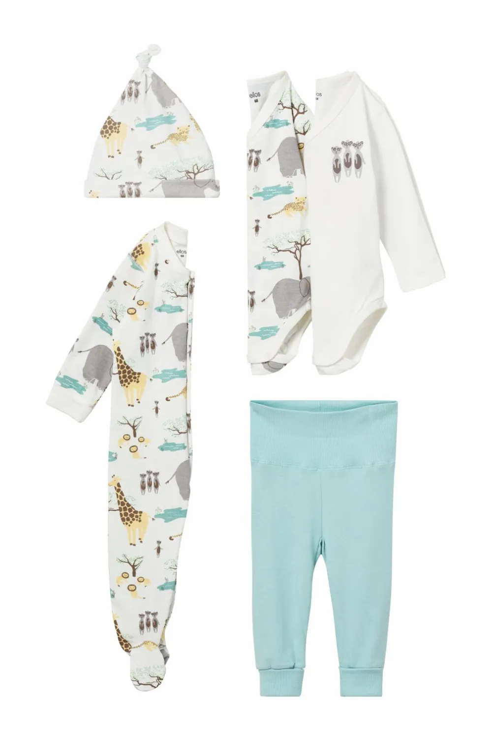 Startpakke eller gavesæt i 5 dele til barnets første tid. Tøjet er i blød jersey af økologisk bomuld.