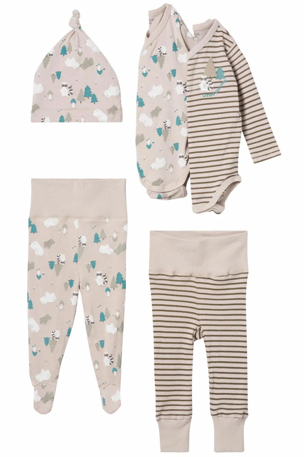Startpakke eller gavesæt i 5 dele til barnets første tid. Jersey af økologisk bomuld.