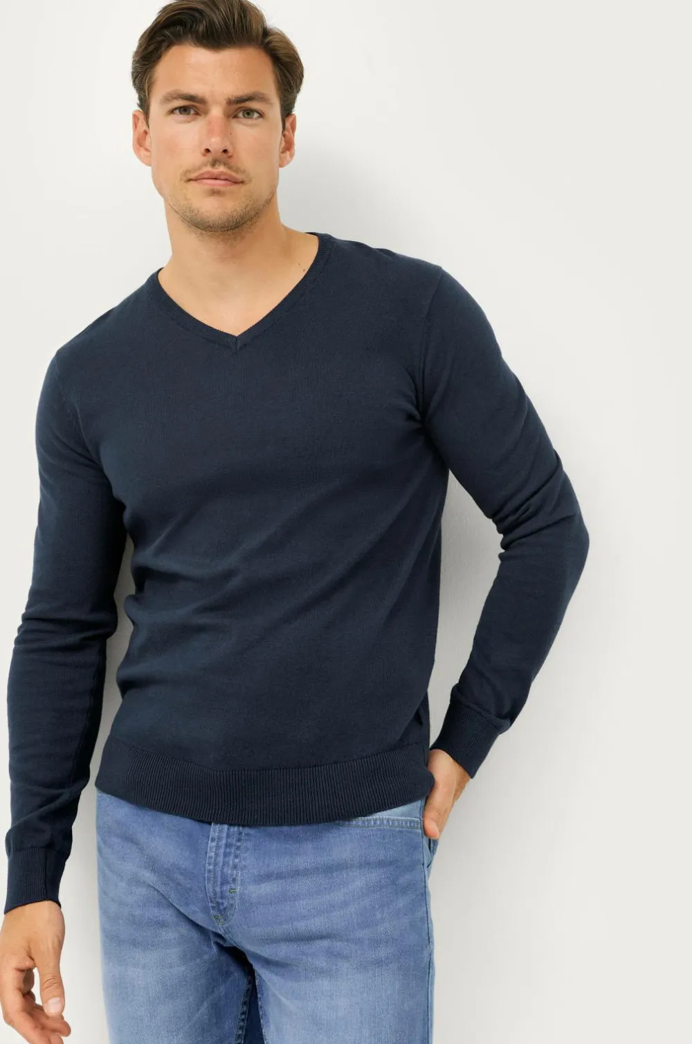 Trøje med V-hals fra On Our Terms. Finstrikket model i lige design med V-formet halsudskæring som har ribkant. Også ribstrik i kanten forneden og ærmekanten. Længde ca. 70 cm i str. M.
