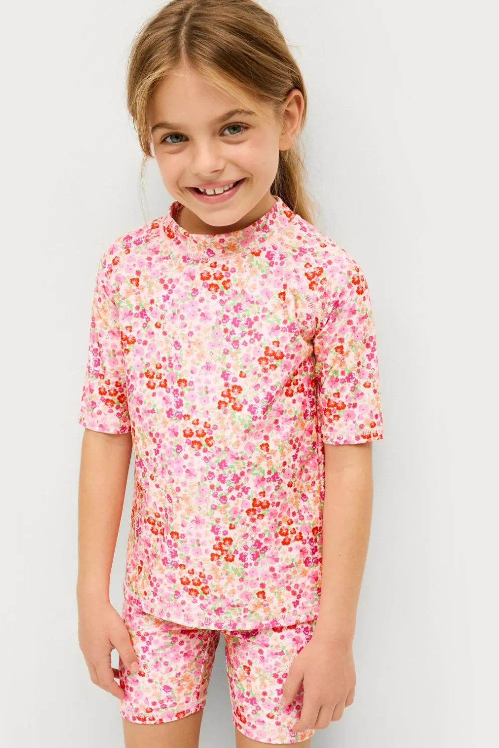 Solbeskyttelsessæt i to dele. Kortærmet top med rund hals og shorts med elastisk talje.