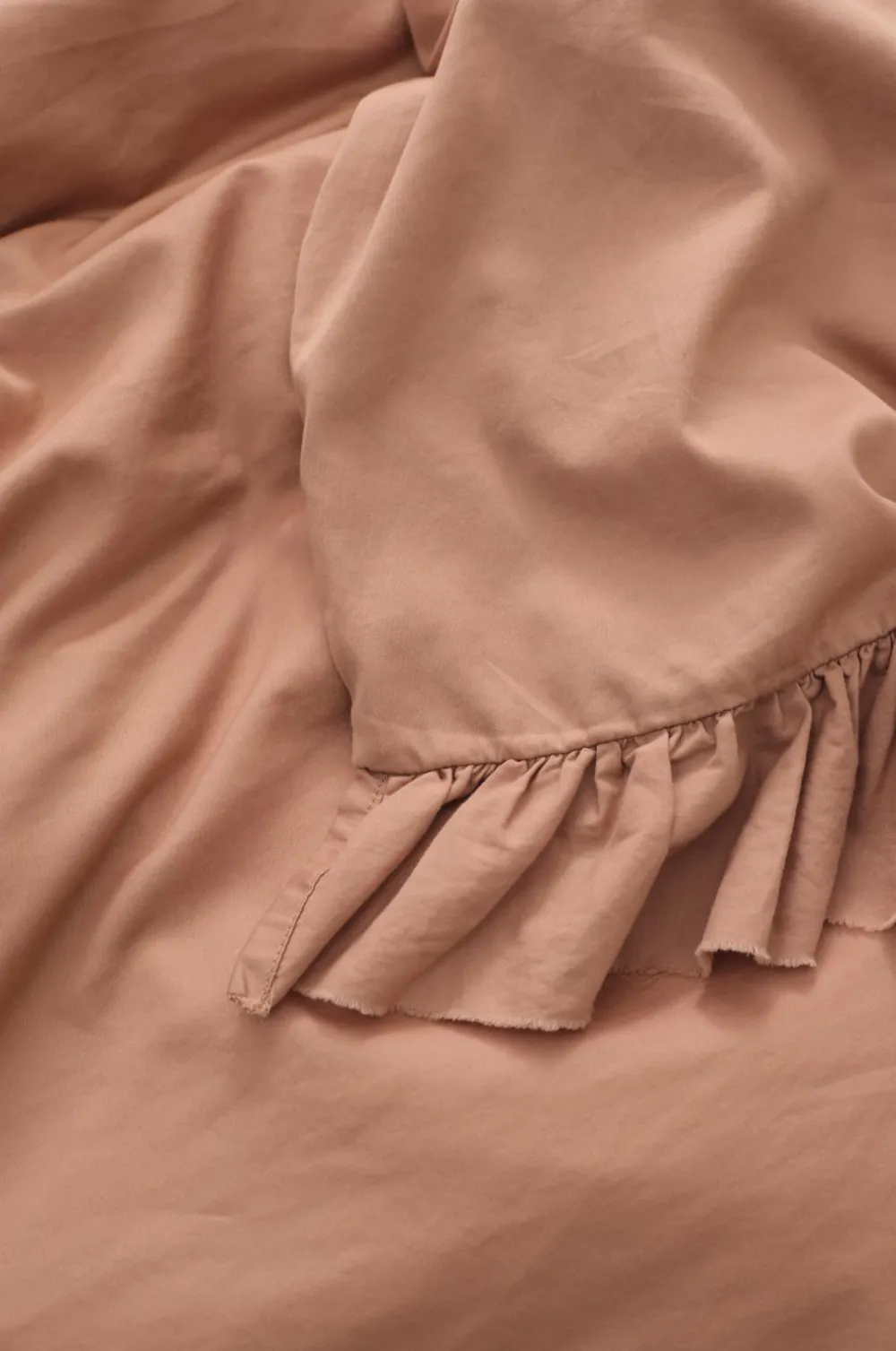• Af bomuldssatin i vasket kvalitet som giver en silkemat, let glans og et blødt, glat udtryk. Stoffet føles køligt og behageligt mod huden og er både smidigt og praktisk.
