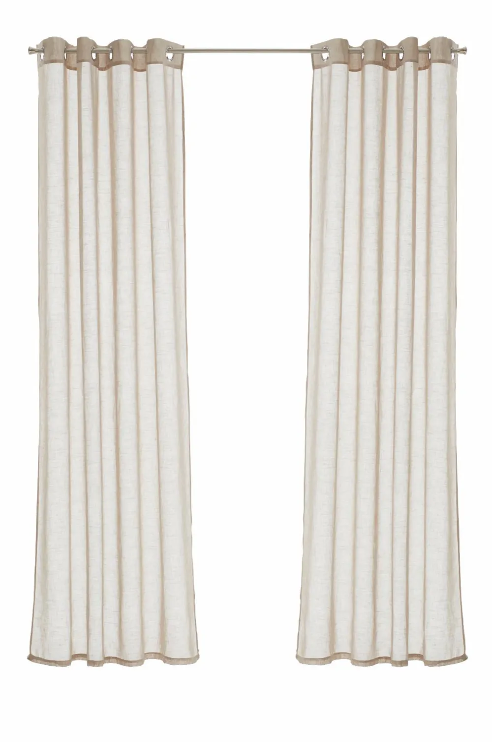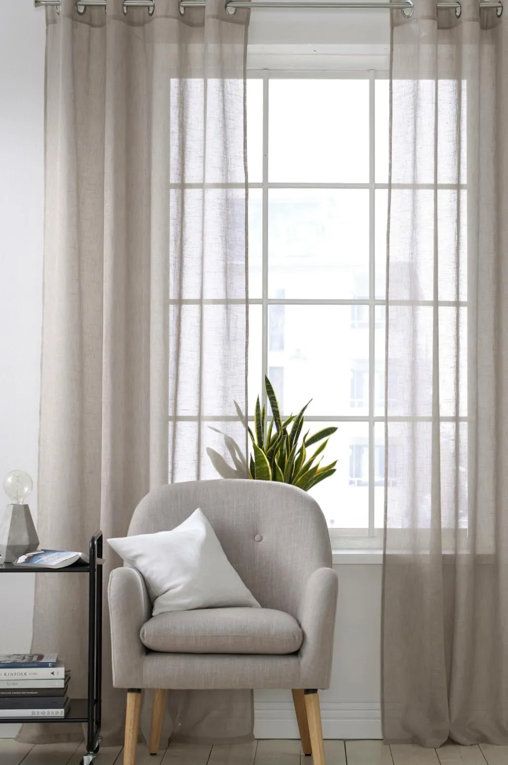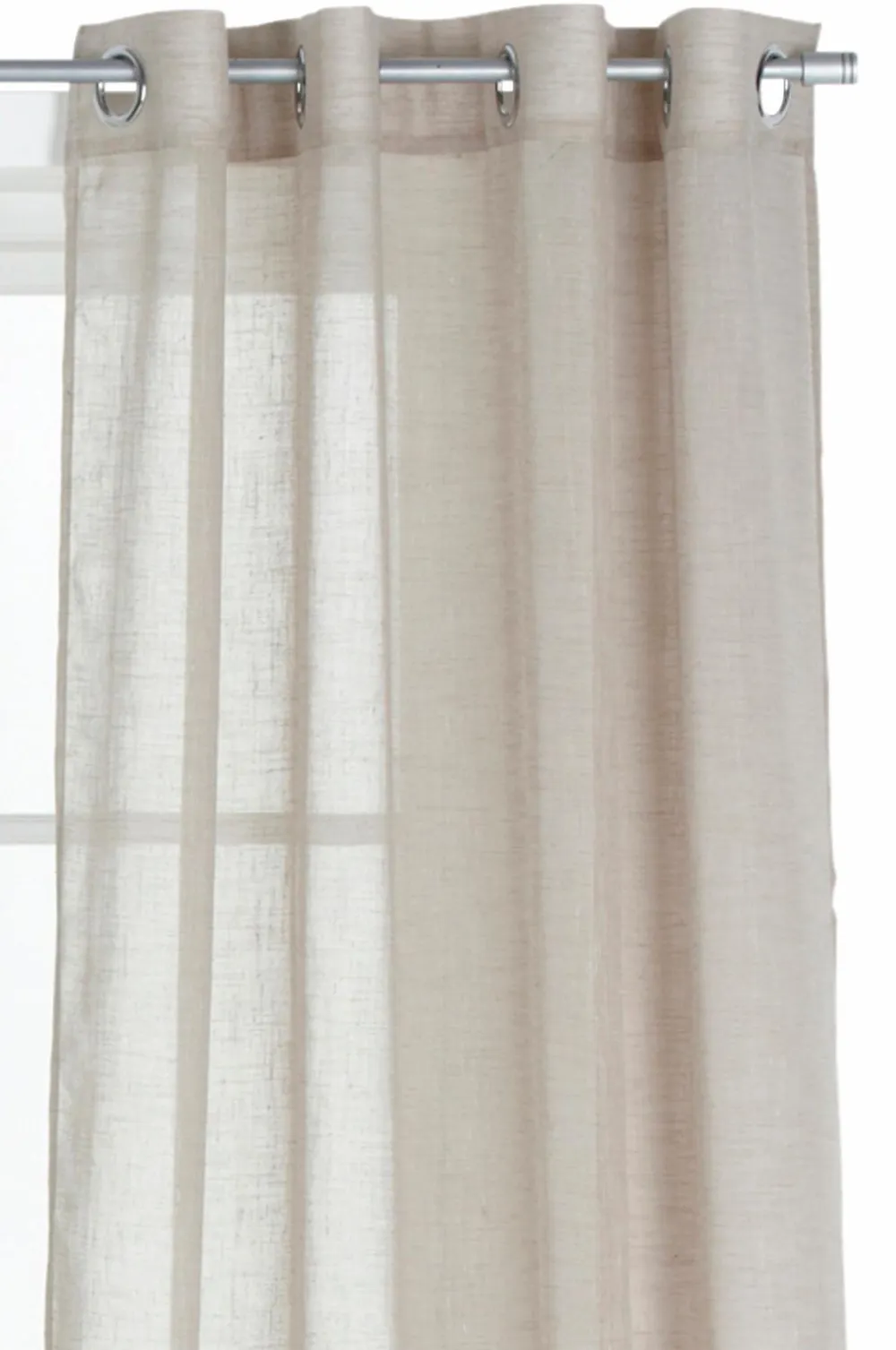 Sejlringe af sølvfarvet metal. Voile med hørtouch af 85% polyester og 15% hør med struktureffekt. Vask 30°. Bredde 140 cm.