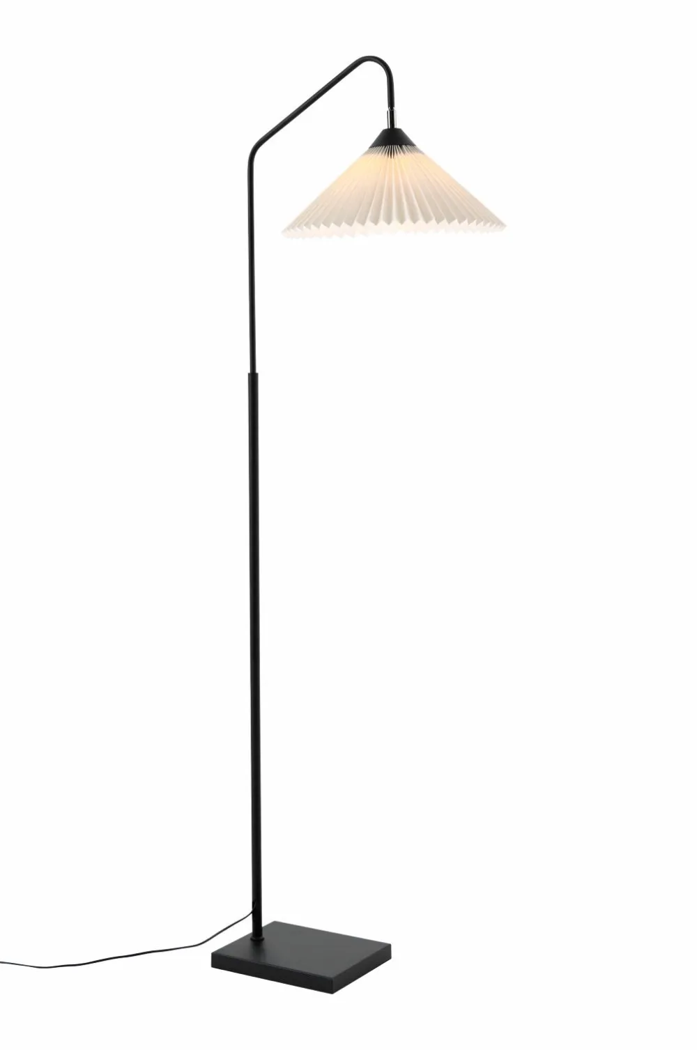 Gulvlampe med fod af metal i matsort finish og skærm af plisseret tekstil. Skærmen kan rettes lidt i alle retninger. Sort ledning med strømafbryder ved gulvet.