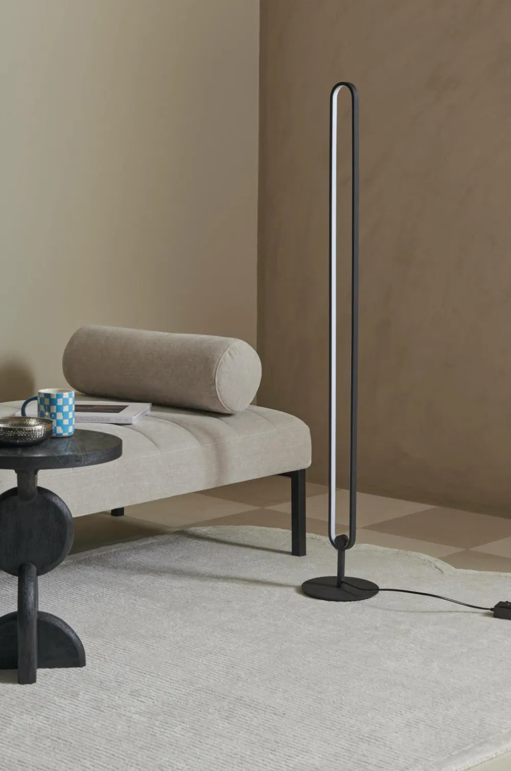 Gulvlampe i minimalistisk design af metal i mat finish. Lampen er enkel og stringent i stilen. Integreret LED-belysning (kan ikke udskiftes) og indbygget dæmper. Strømafbryder med dæmperfunktion. Sort PVC-ledning. Forventet levetid: 36.000 timer.