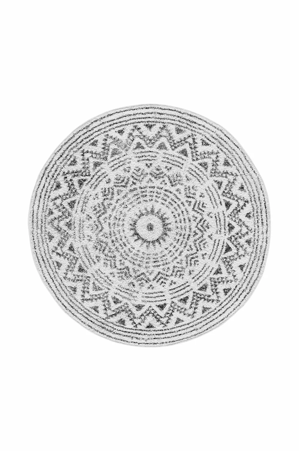 Tuftet, rund badeværelsesmåtte i blød, vamset bomuld med udtryk og look som et ryatæppe. Printet mønster, som varierer i kontrast og tydelighed afhængigt af, hvordan luven i tæppet lægger sig. Ø 80 cm.
