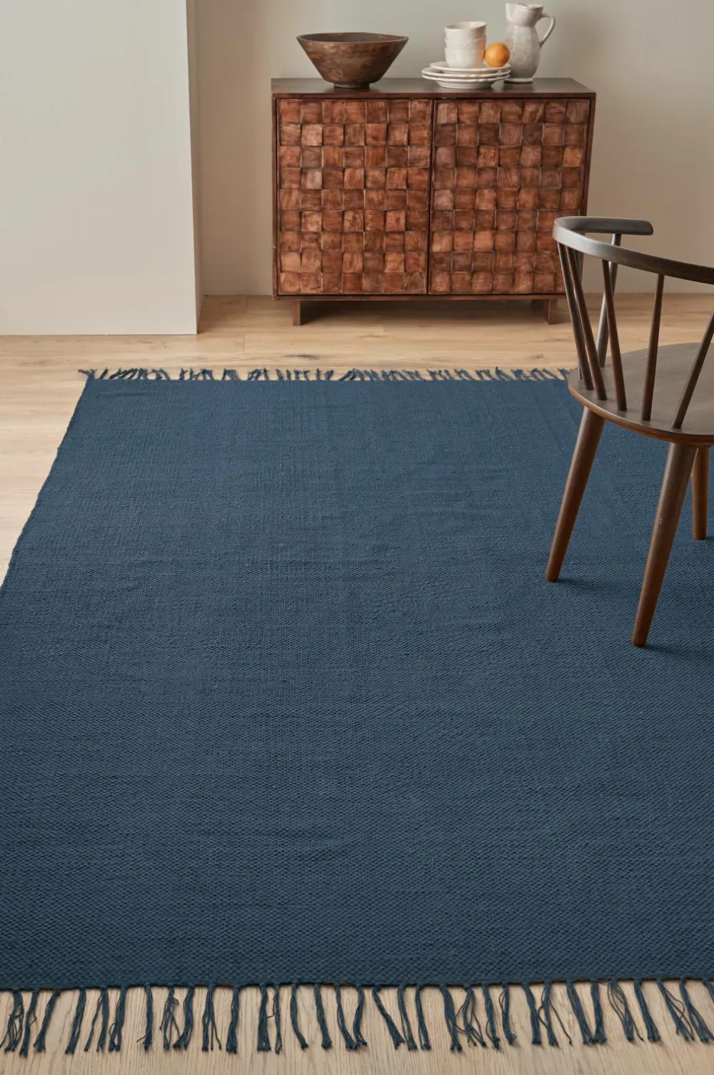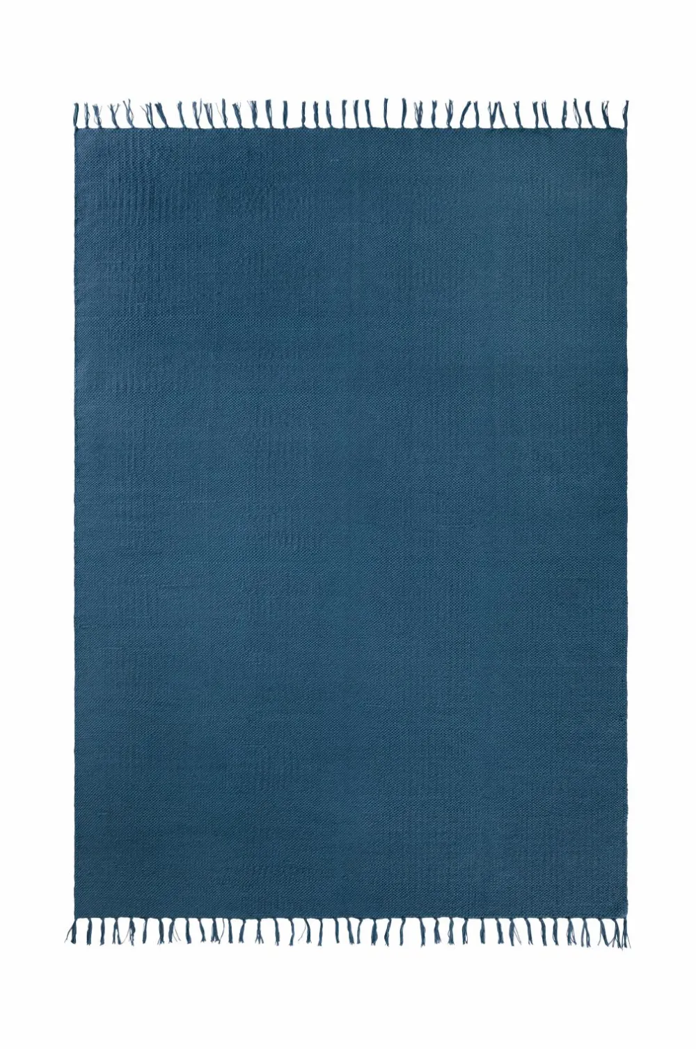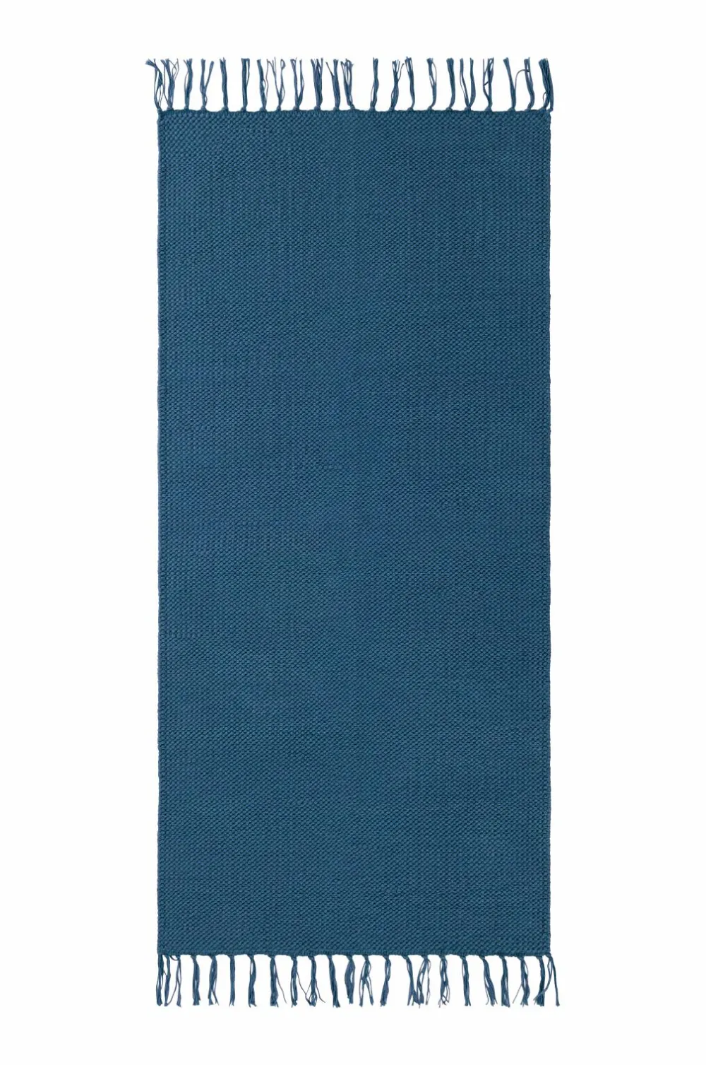 Glatvævet bomuldstæppe med farvede frynser. Højde 0,5 cm.