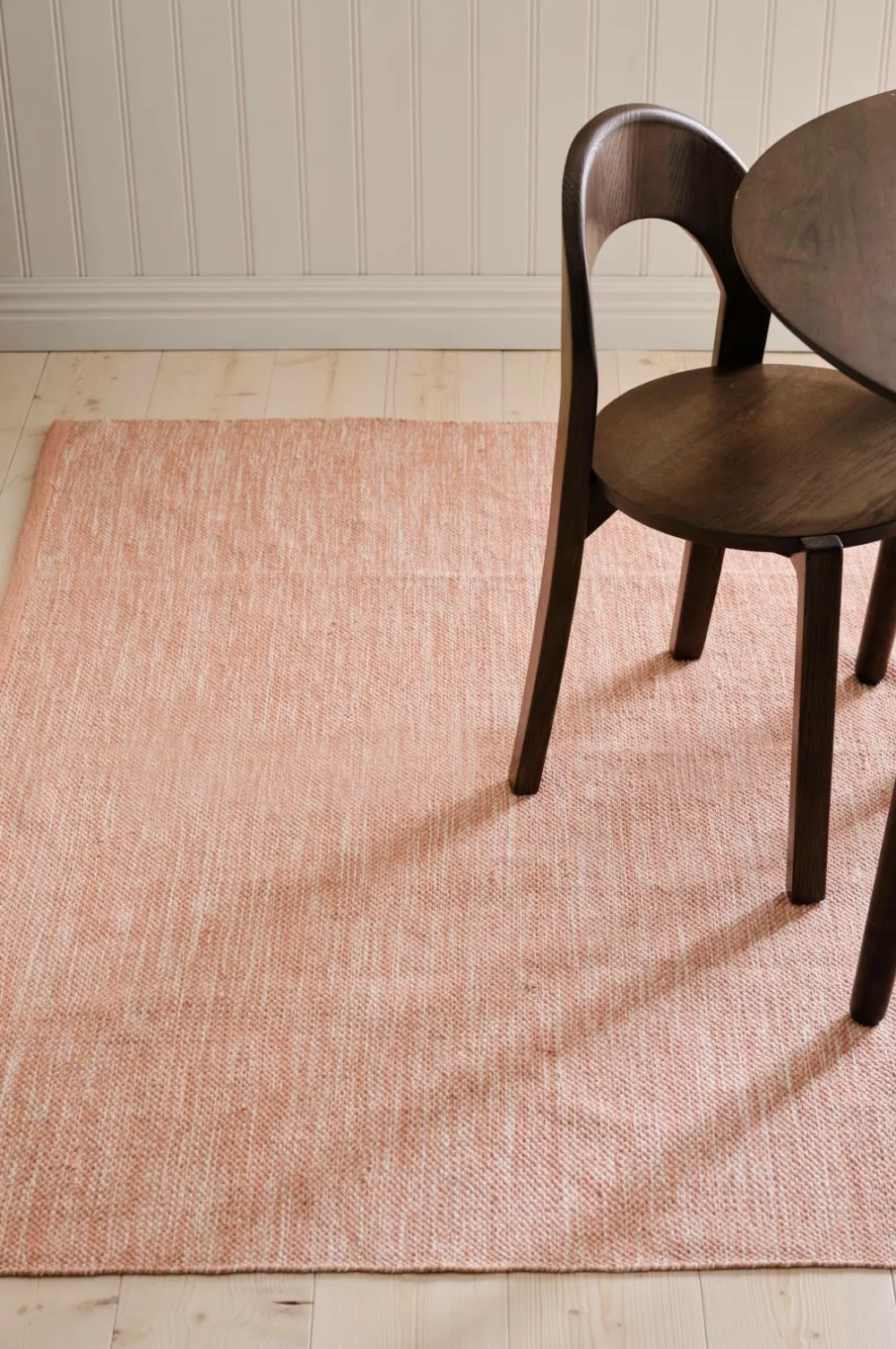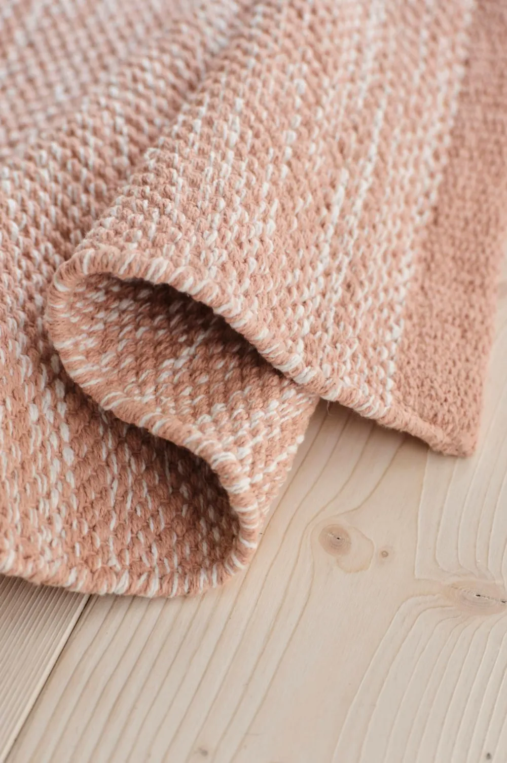 Glatvævet bomuldstæppe i melangefarvet garn med ensfarvede borter i enderne. Højde 0,5 cm.