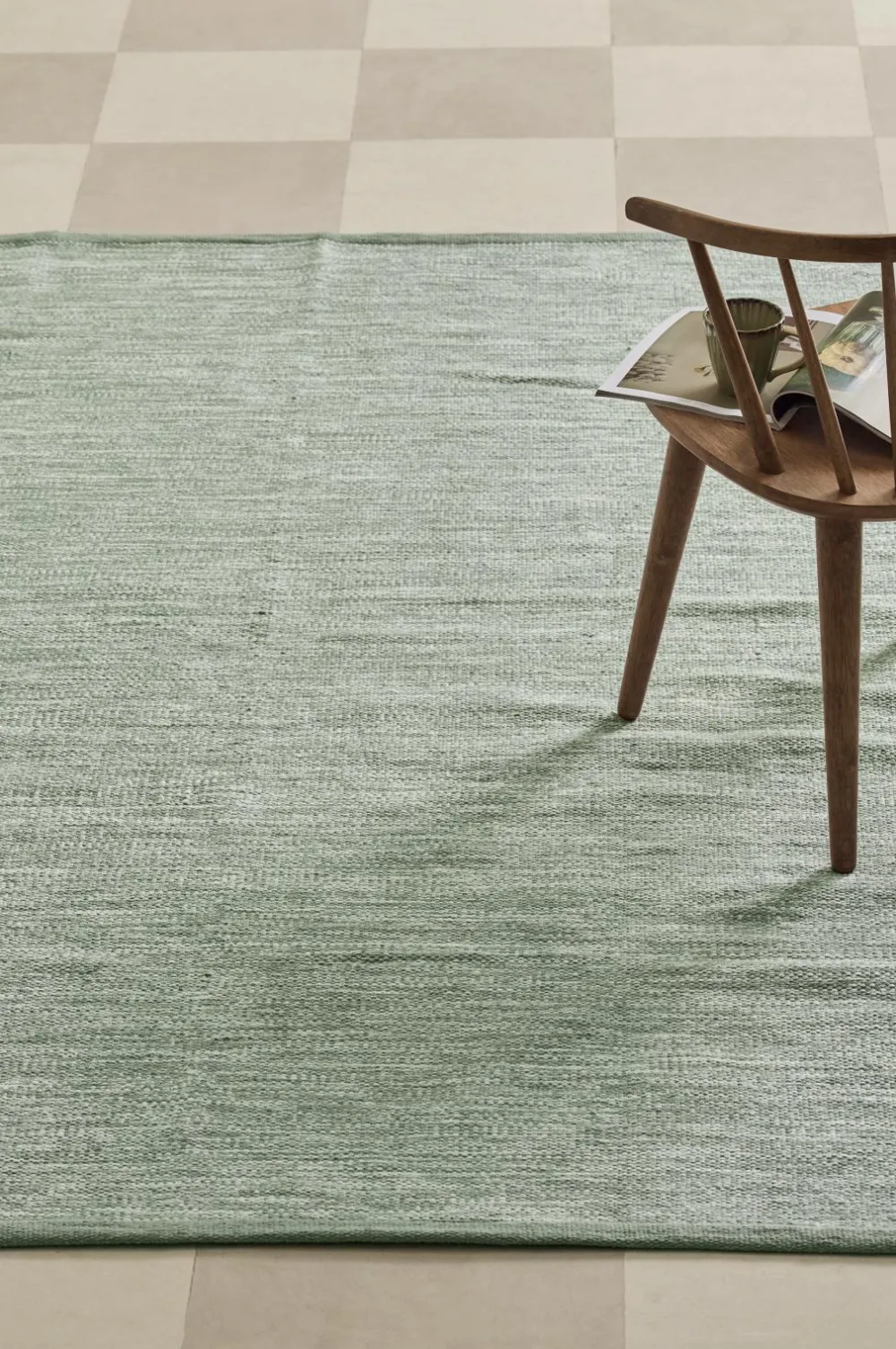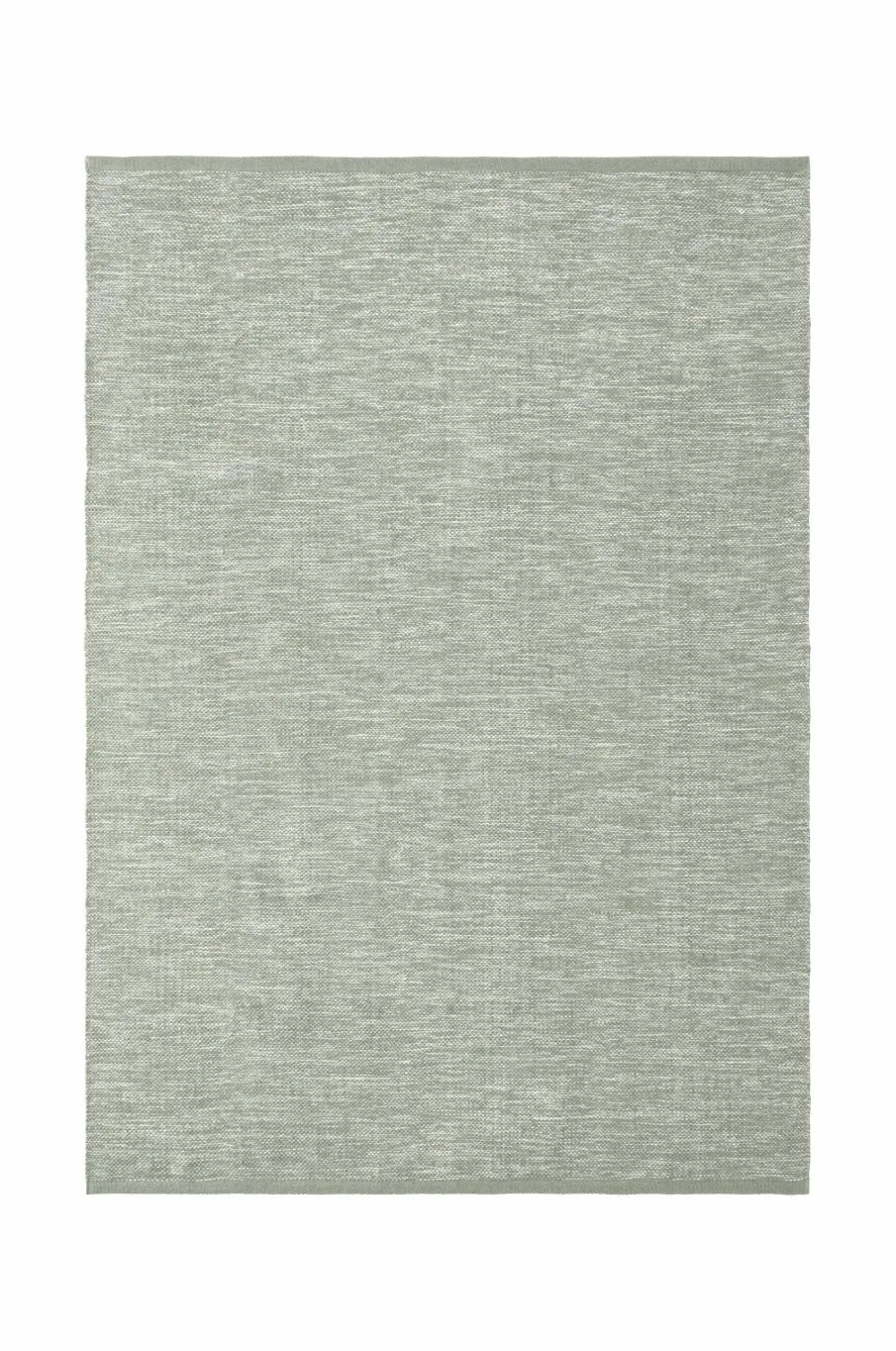 Glatvævet bomuldstæppe i melangefarvet garn med ensfarvede borter i enderne. Højde 0,5 cm.