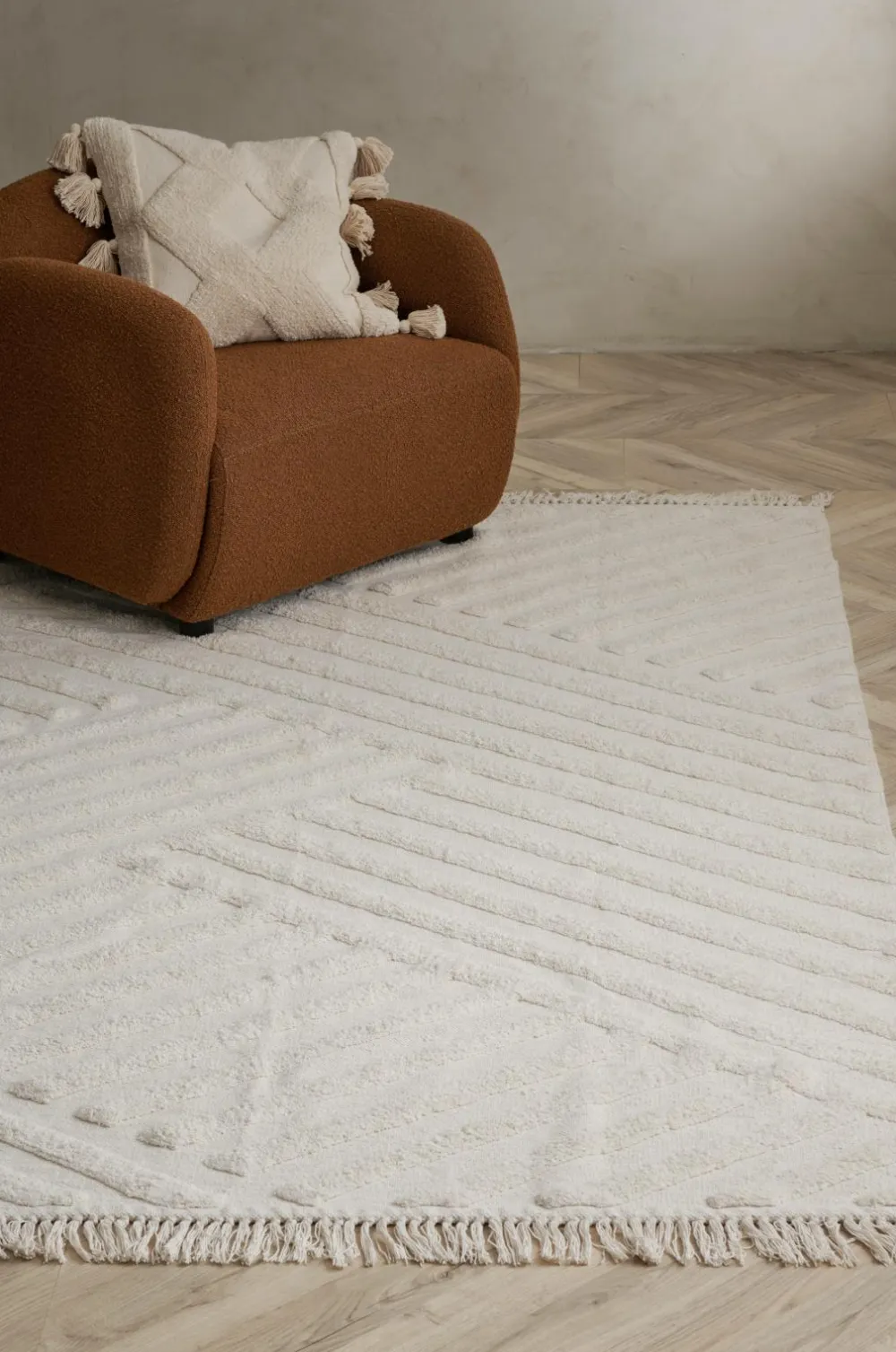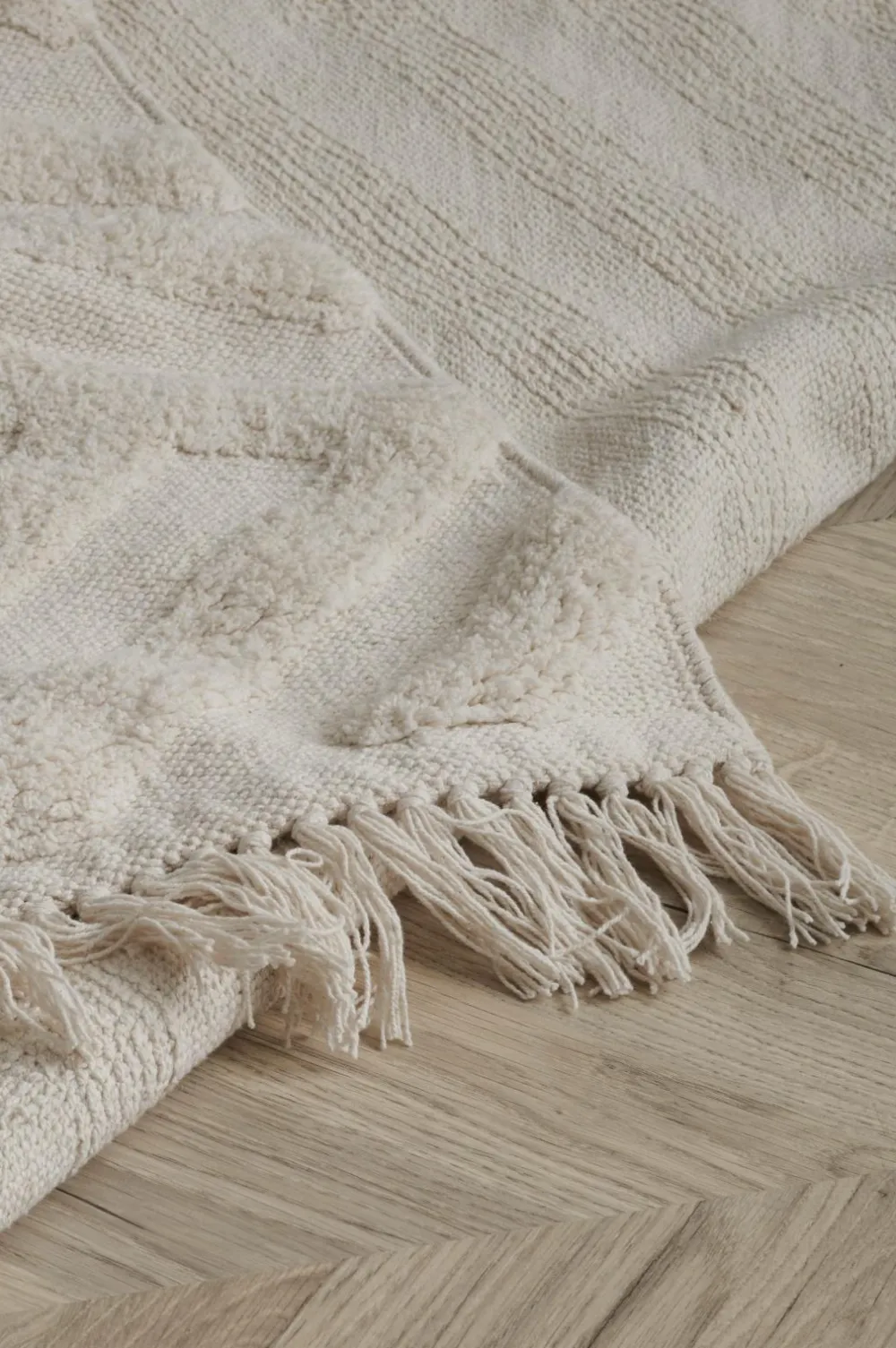 Bomuldstæppe Viterbo har en glat forside med et dekorativt, tuftet diagonalmønster. Frynser med knuder.