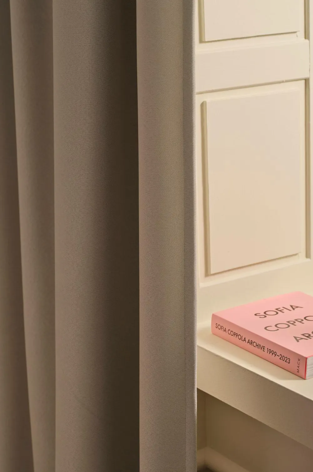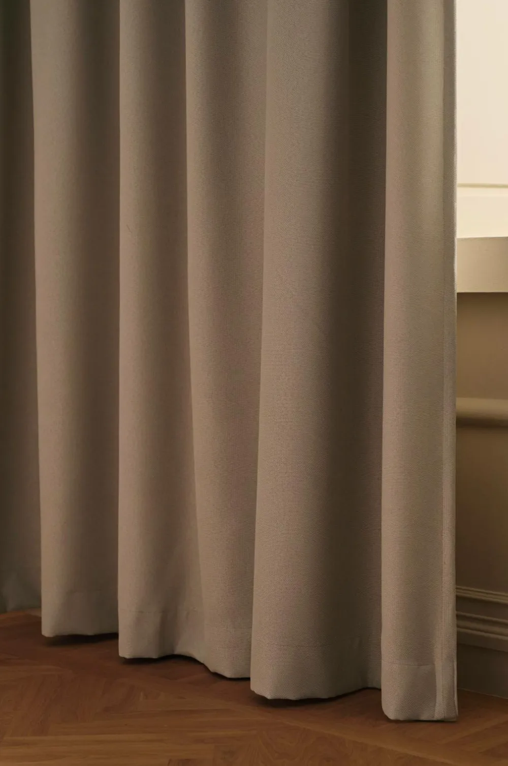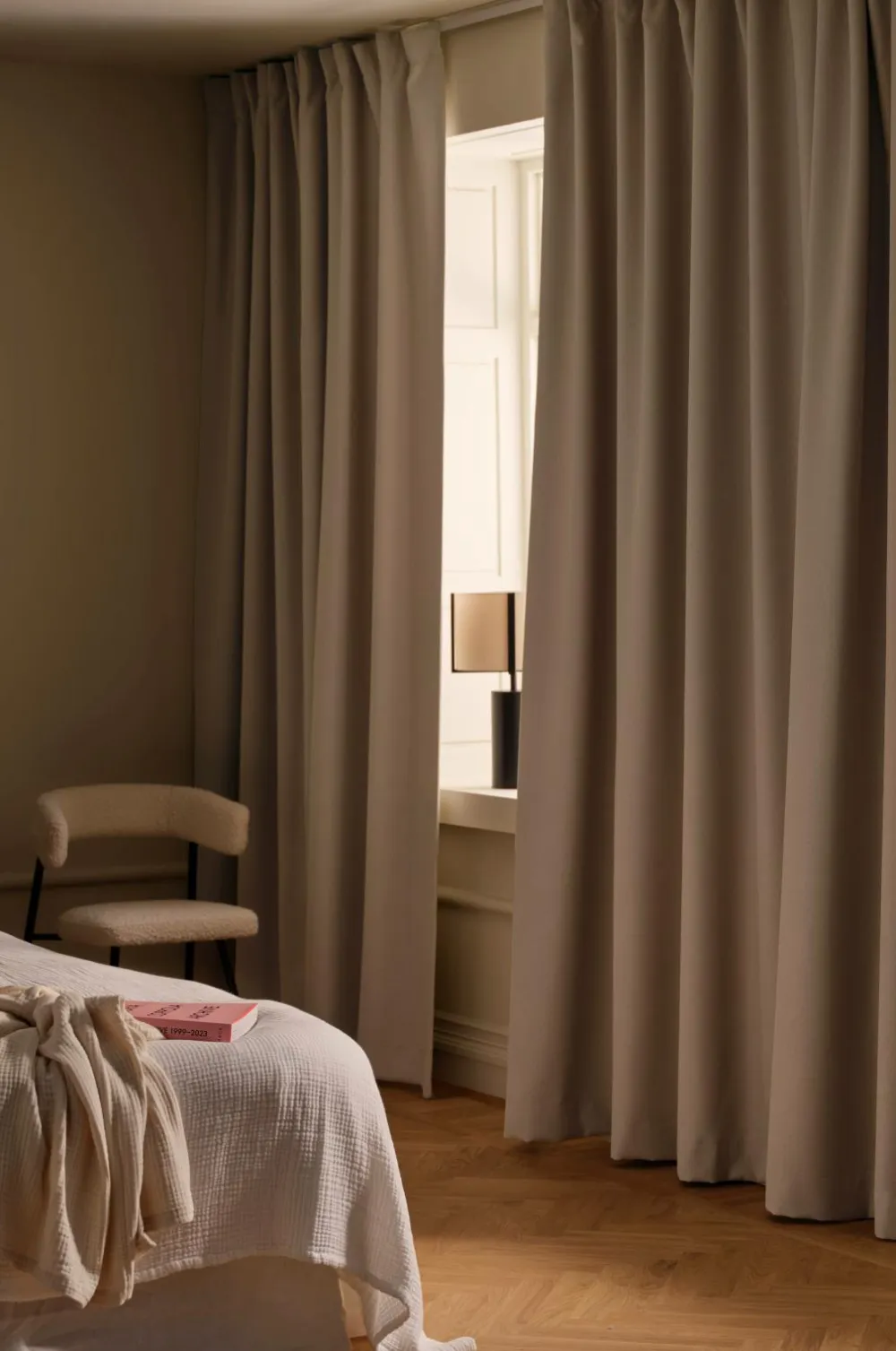 DEJA er et tidløst mørklægningsgardin i et lidt grovere vævet stof. Gardinet har en vævet for- og bagside med et sort mellemlag, som giver en mørklægningseffekt uden at belægge stoffet. Vævningen giver gardinet et rustikt udtryk med struktur og en levende farvenuance. Gardinet har et flot fald og en behagelig drapering, og bagsiden er lige så flot som forsiden. Vær opmærksom på, at de forskellige farver varierer i mørkhed, og at mørke farver er mørkere, mens de lyse farver er mere lysreducerende. Den klassiske farveskala indeholder neutrale farver, som blender ind uden at tage fokus. DEJA-gardinet er fremstillet af certificeret genbrugspolyester. Længderne har påsyede multifunktionelle bånd i toppen, og de kan hænges op ved hjælp af fingerkroge, en kanal og en skjult bøjle.