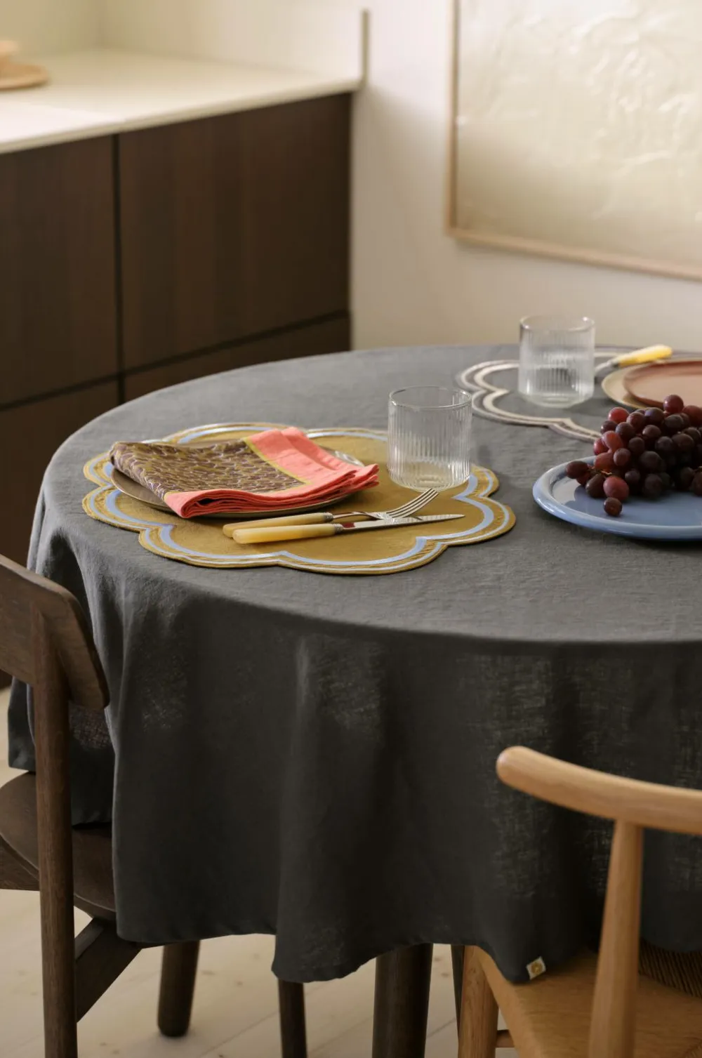 • Rund, ensfarvet dug i bomuld og hør med blød, vasket afslutning