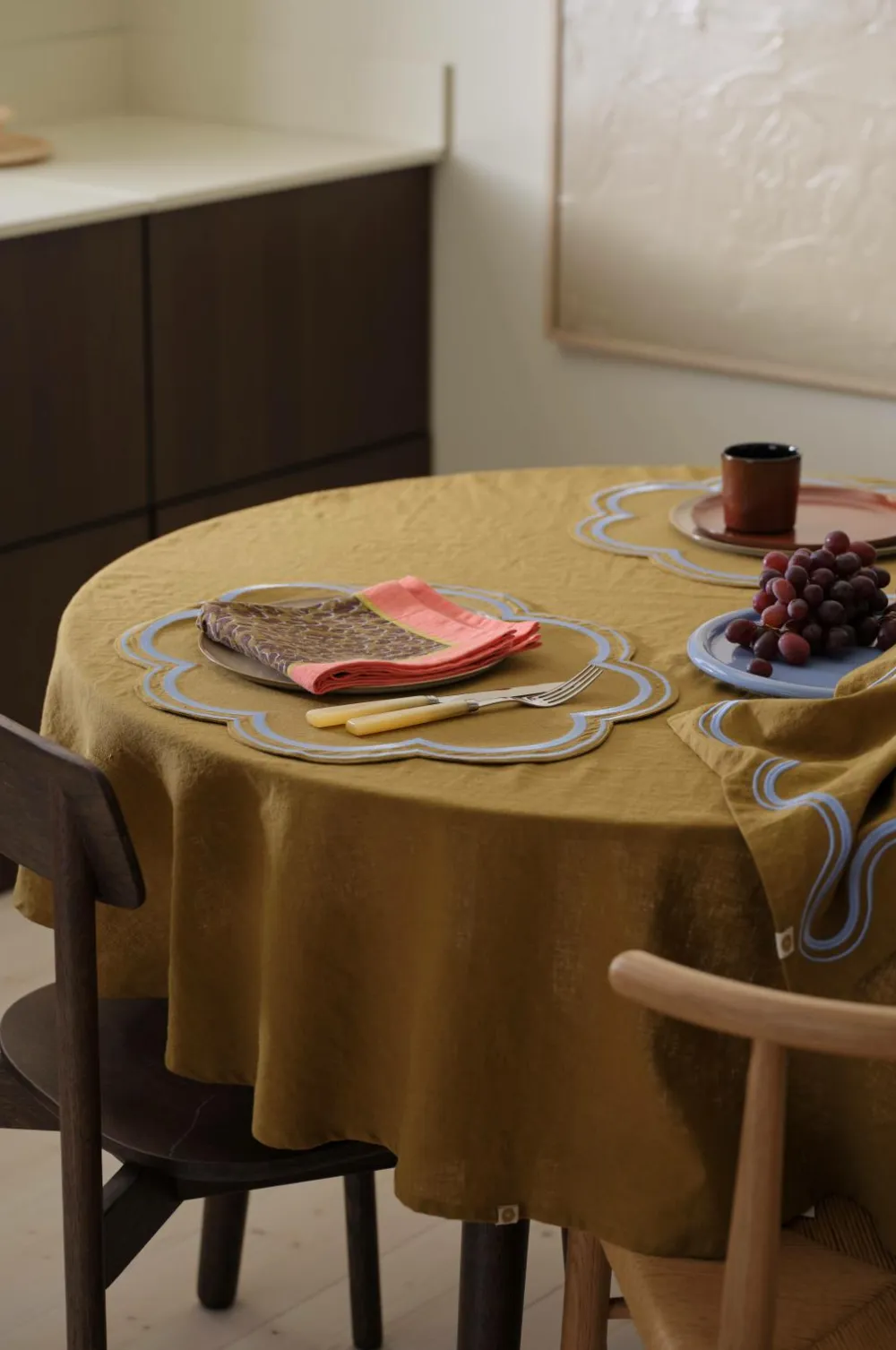 • Rund, ensfarvet dug i bomuld og hør med blød, vasket afslutning