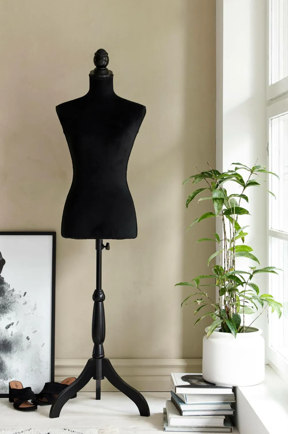 Gine af mdf og træ beklædt med plys af bomuld. Regulerbar totalhøjde 133-165 cm. Ginens mål: Bryst 87, talje 65, hofte 90 cm. Højde på kroppen 65 cm. Ø ved foden ca. 40 cm. Lev. usamlet. Produktet indeholder FSC-certificeret træ, som er fældet i et ansvarsfuldt skovbrug, der tager hensyn til mennesker og miljø.