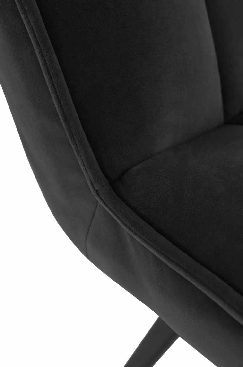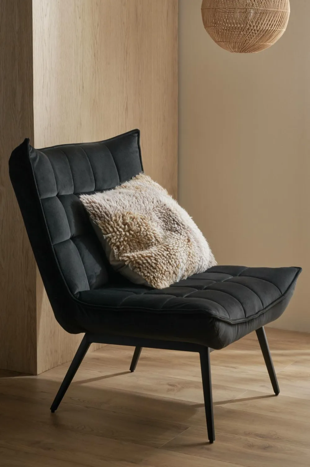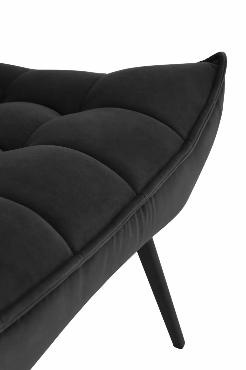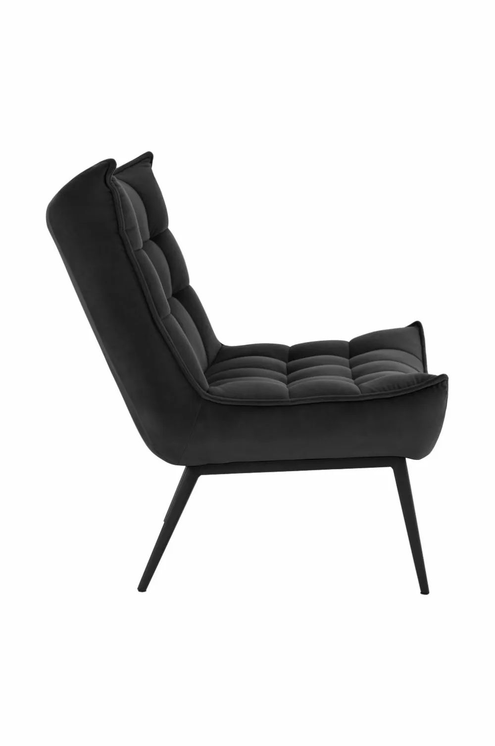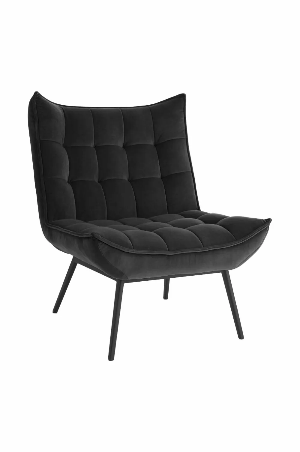 Lænestol med paspoleret kant rundt om. Indfældninger, der danner et dekorativt ternet mønster. Skumfyld. Ben af metal. Lettere samling.
