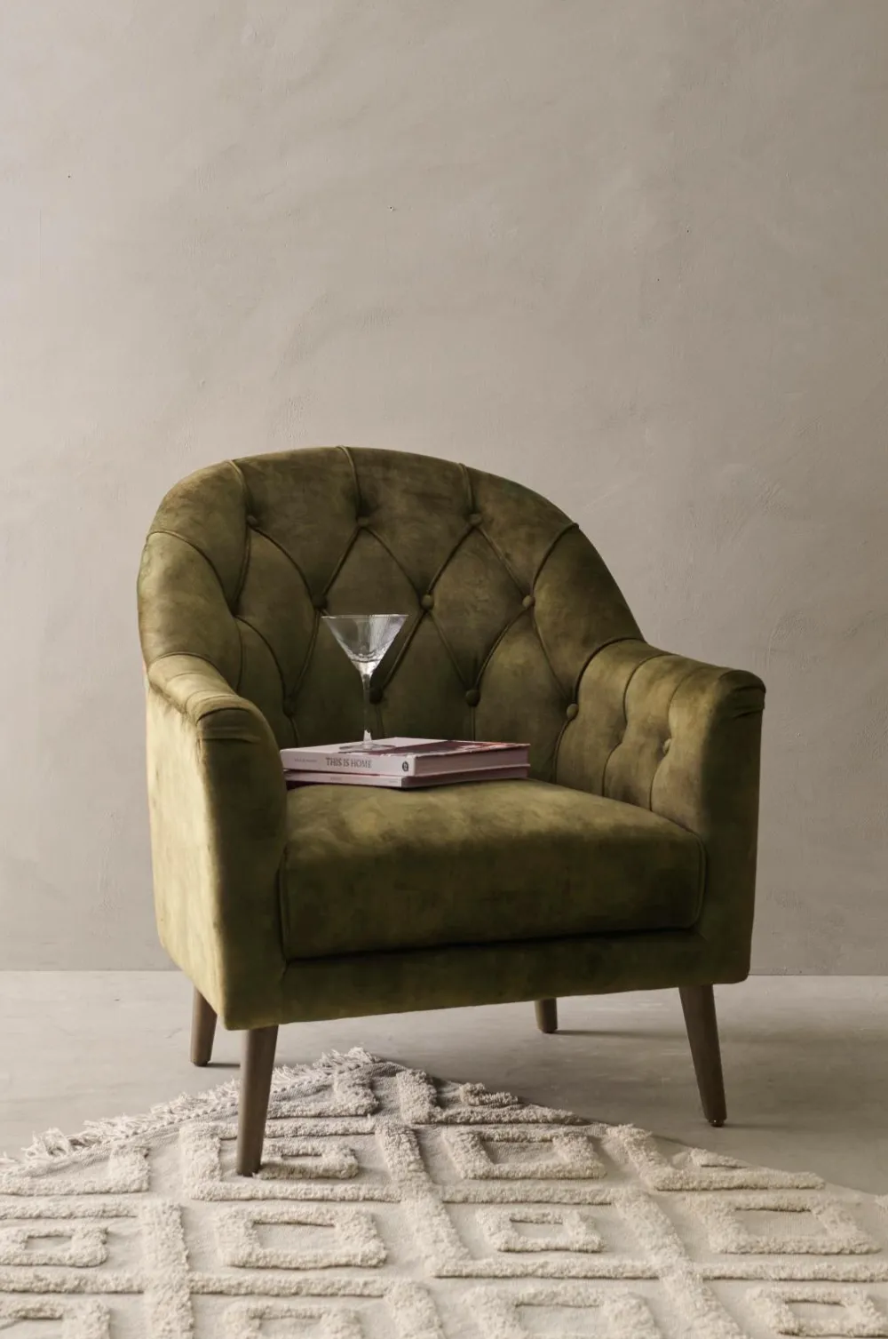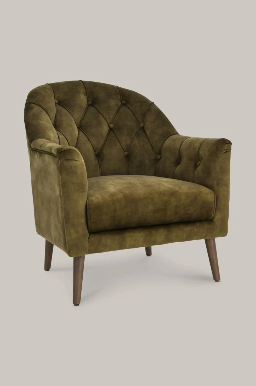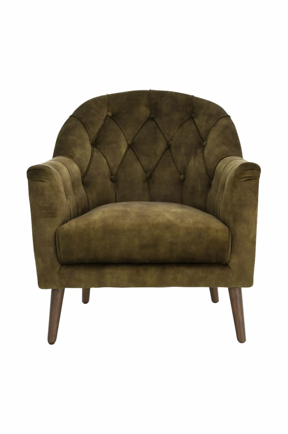 Lænestol med ben og stel i gummitræ. Betræk i meleret velour med smuk glans. Knapper på indersiden. Lettere samling.